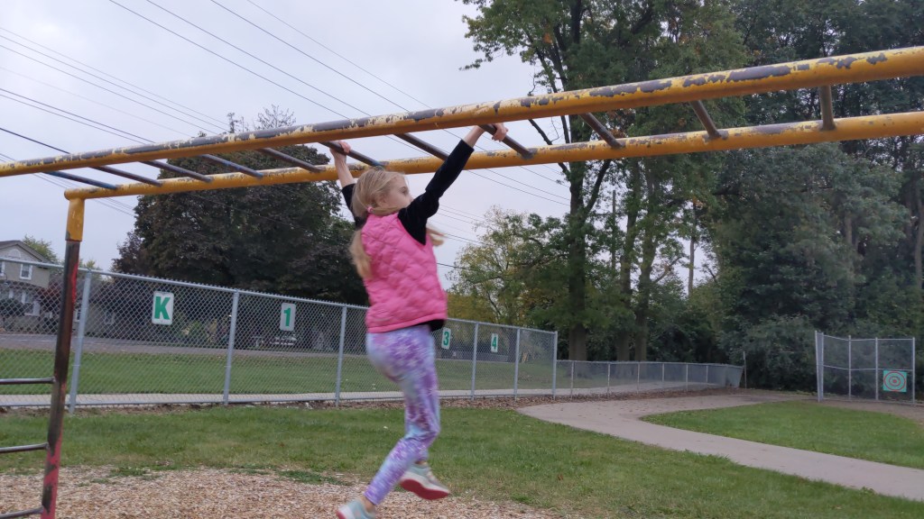 October 5, 2021: My height might be catching up to Jameson, but she still has really long arms. I think it’s from playing on the monkey bars all the time. I’m still learning to do them, but she’s like an expert. The problem is I’m not a big fan of heights or falling, my arms are short, and I’m tickly when daddy tries to help me. I’ll keep practicing.
