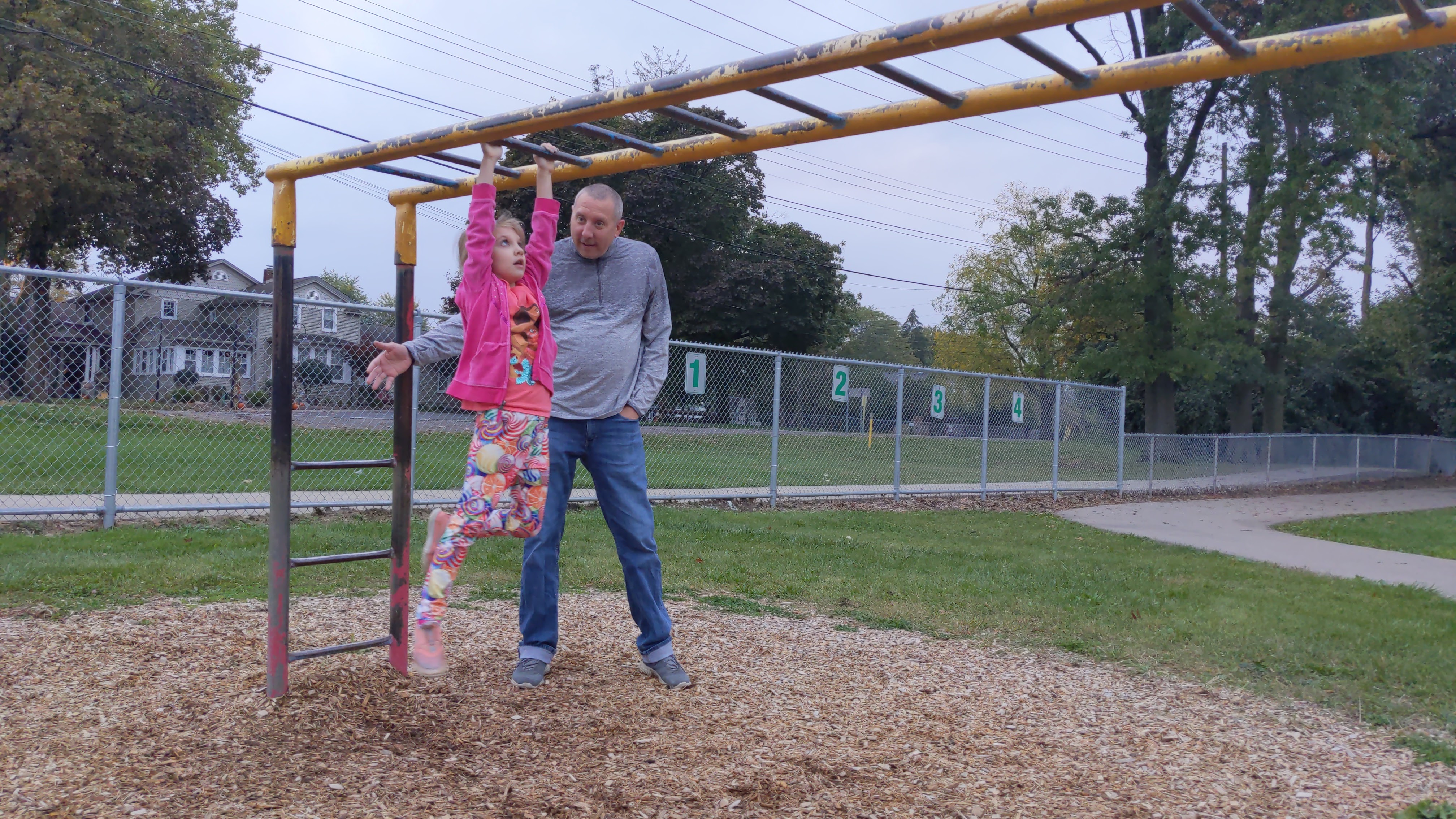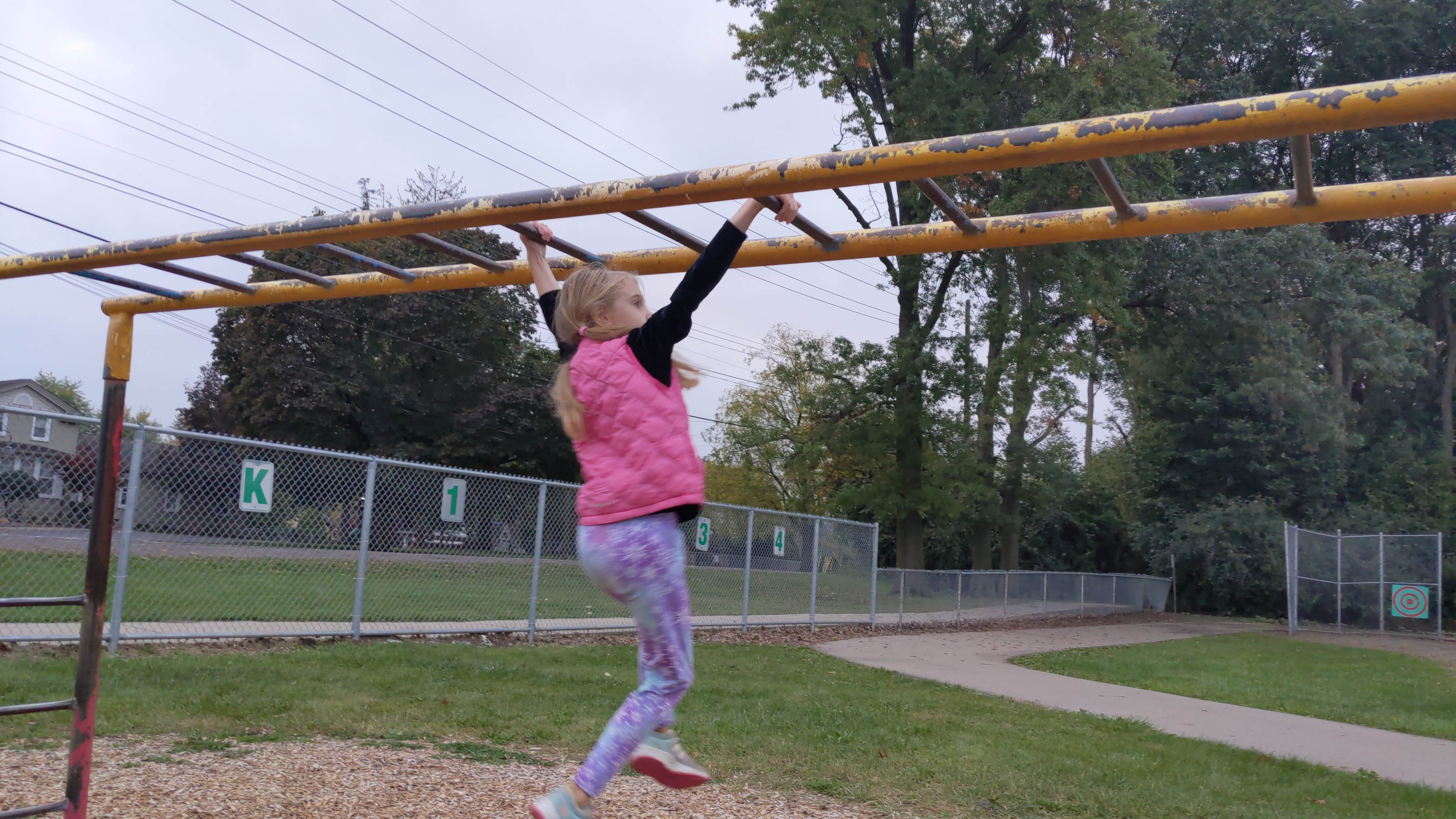 October 5, 2021: My height might be catching up to Jameson, but she still has really long arms. I think it’s from playing on the monkey bars all the time. I’m still learning to do them, but she’s like an expert. The problem is I’m not a big fan of heights or falling, my arms are short, and I’m tickly when daddy tries to help me. I’ll keep practicing.