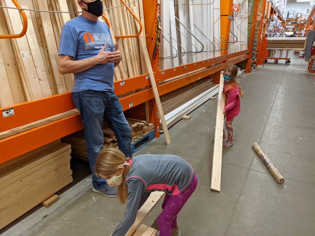 October 14, 2021: We planned on going outside after dinner so I could work on my jump roping. But by the time we got out, it started raining. We wanted to jump rope in the garage but daddy’s saw is taking up all the room. His saw will go in the basement once he finishes mommy’s project…..so, we went to Home Depot instead in search of wood to get the next project moving. It’s a good thing daddy taught me how to pick out straight pieces of wood or mommy’s new planter would have been very bendy!
