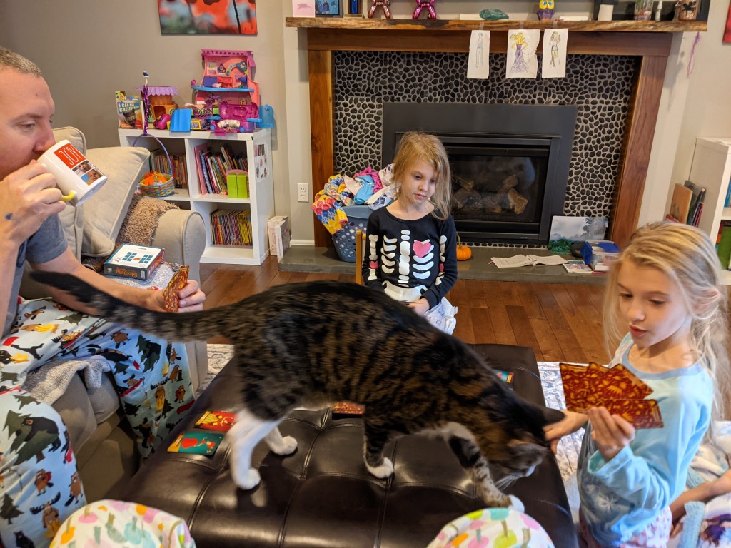 October 23, 2021: Since we got a new couch we had to get a couple more things. We got a super soft rug and a fancy footrest that opens up. The best part about the footrest is that it also doubles as a table for all the games we like to play. It’s really working out, but we didn’t expect Harley to like it so much. It’s kinda hard to play when he gets in the middle of our card table!