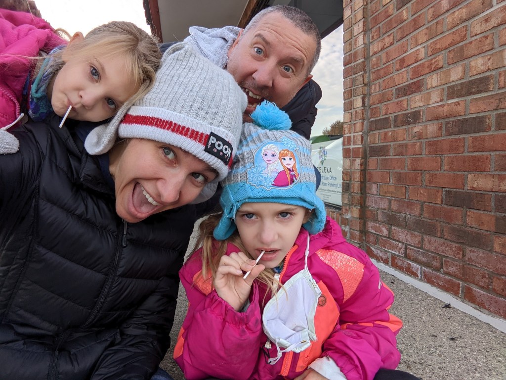 November 6, 2021: Today was a big day. Papa’s birthday AND we got our first vaccine shot! Let me be clear…we were ready for this shot, but we were not prepared to get it in an unfamiliar place with a person we didn’t know. It made us more nervous than we normally are and we cried. A. Lot. That’s ok though. Mommy and daddy treated us all day for being so brave! Being brave means doing something even though you are scared and that’s what we did. After we got our shot, we got lollipops, cupcakes, Wendy’s, frostys, books at the library, new toys from the toy store, time to jump in the leaves, a fire, s’mores, and a movie night! We are so glad that one is over. Time to start think about what kind of reward we’d like for the second shot they told us is coming in a few weeks.