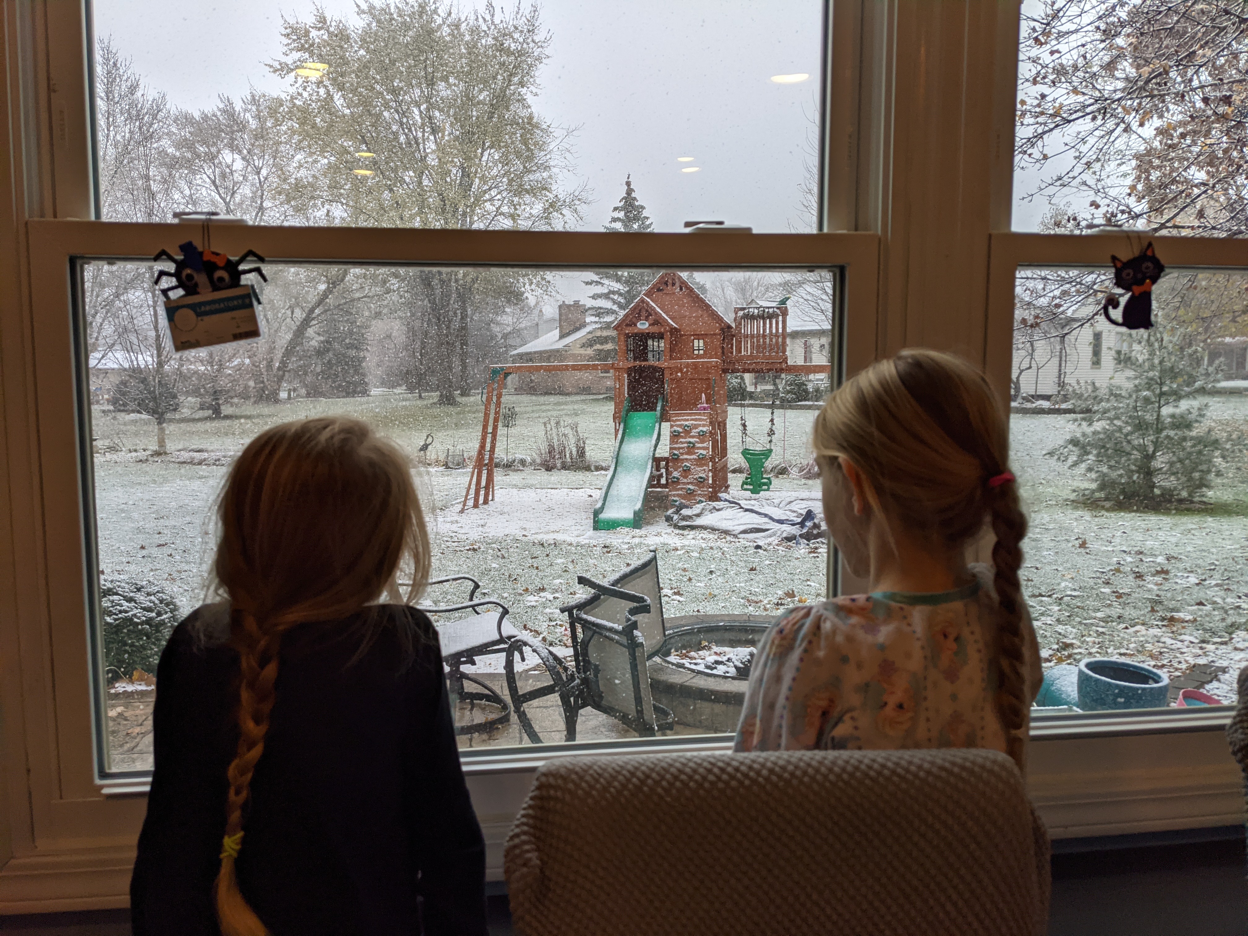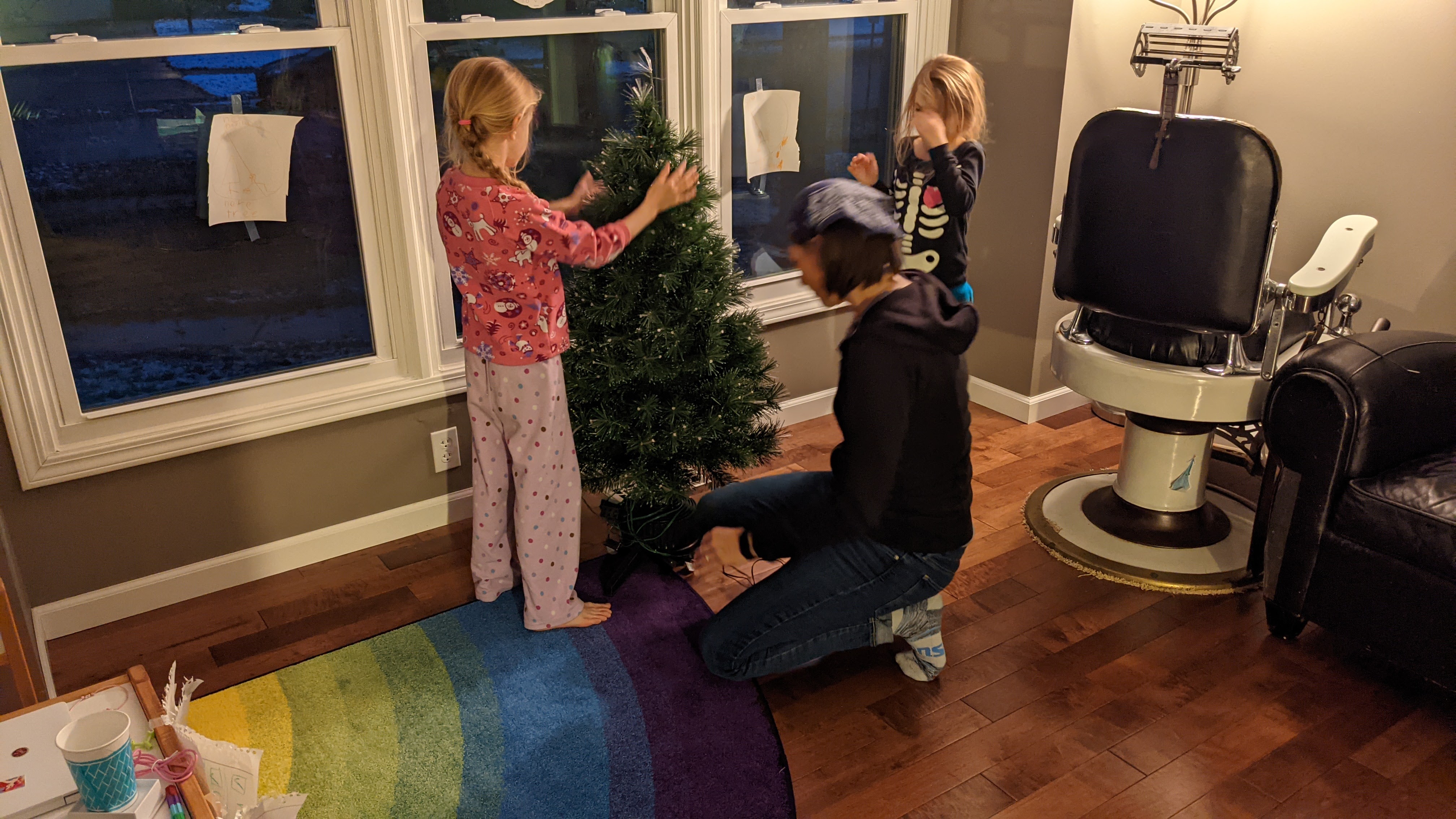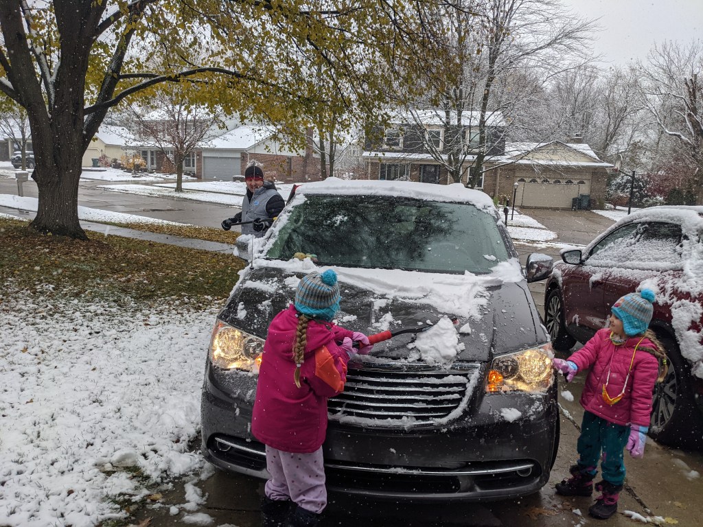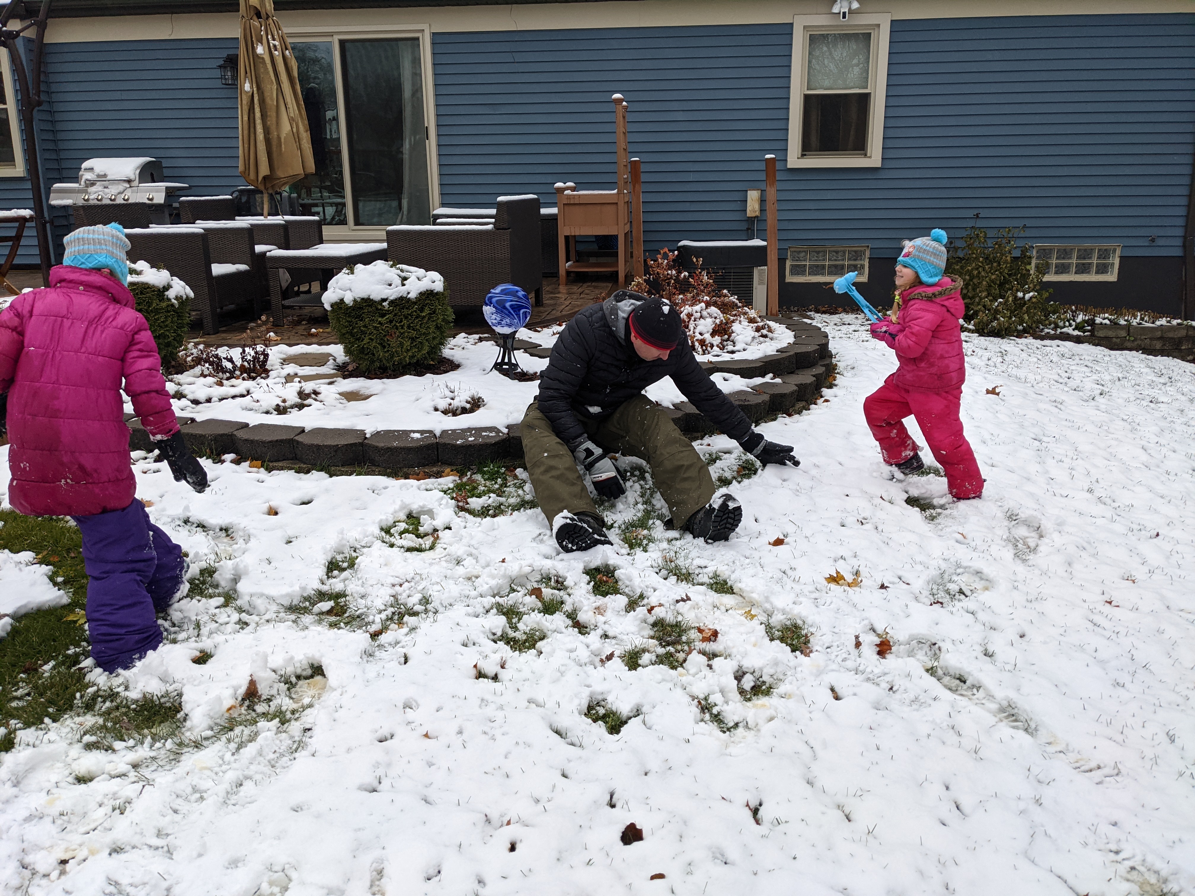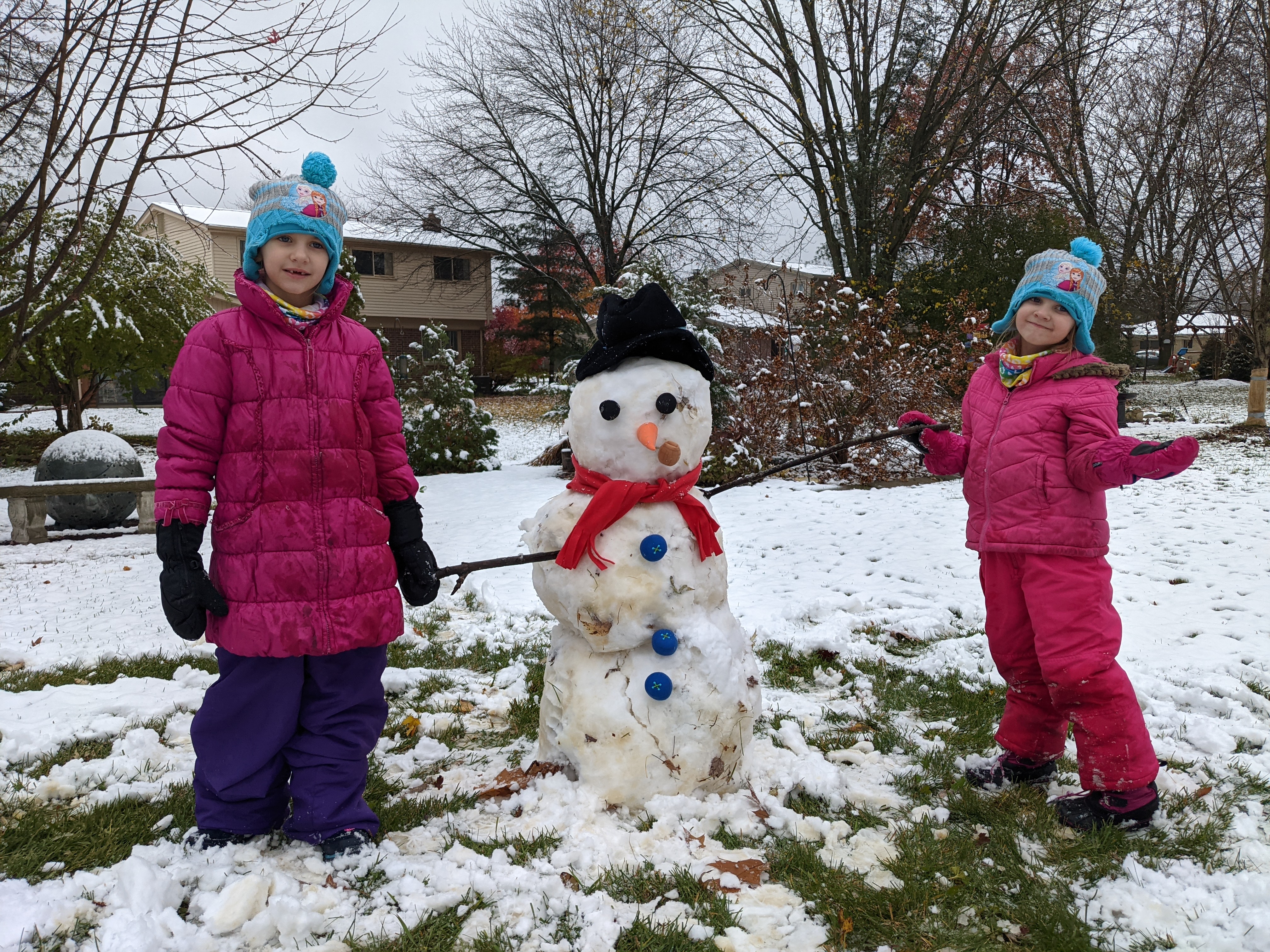 November 14, 2021: We woke up to snow this morning! It was the perfect day to make a snowman, throw snowballs at daddy, drink hot chocolate, and then put up our Thank You tree. Mommy said we could start the tree a little earlier because we have more people to write notes for. I made a bunch already. Finley did a couple. It’s going to be so hard to wait until next week to hand out our notes!