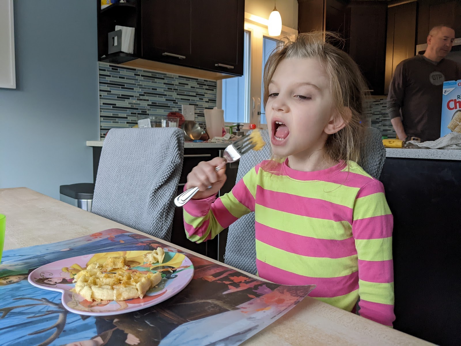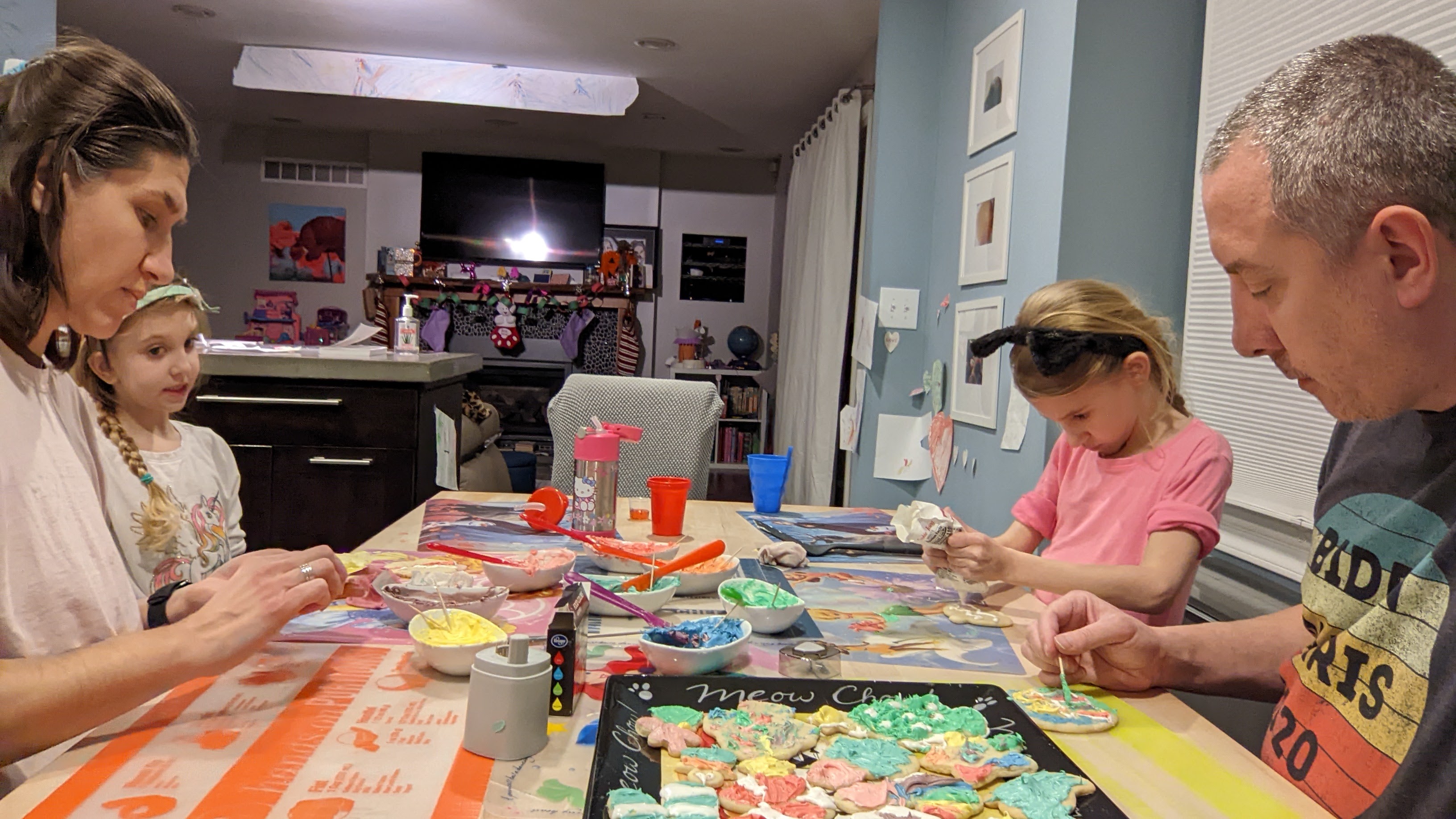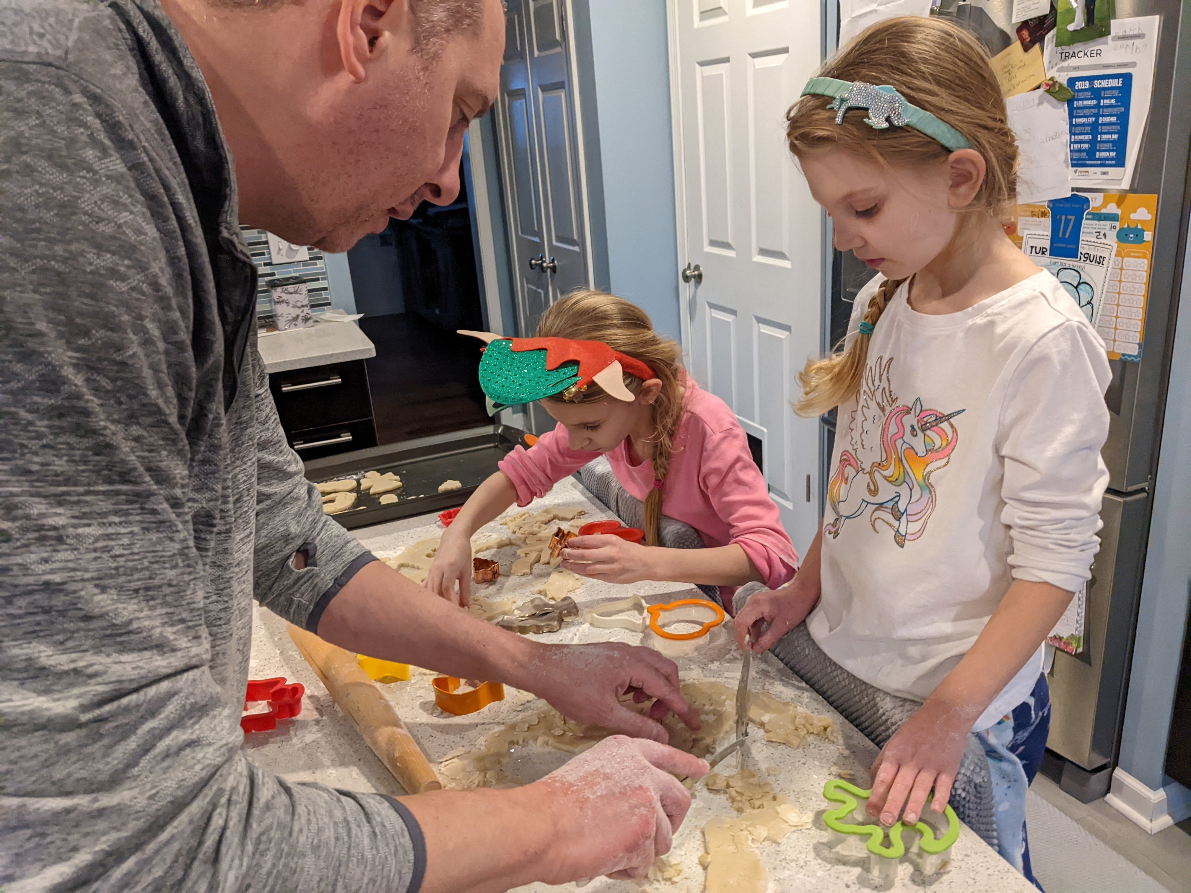 December 23, 2021: Finley is feeling better! Phew! That’s good because we have LOTS of stuff to do. She’s still a little weak because she hasn’t really eaten in three or four days, but she tried to make up it at breakfast. We made sure to give her breaks in between taking a bath, doing laundry, working on Christmas cards, putting up our stockings, delivering and installing Grammie’s birthday present, and making and decorating our Christmas cookies. Nothing like getting right back into it after laying in bed for three days. Sorry, Fin but the fat man needs his cookies!