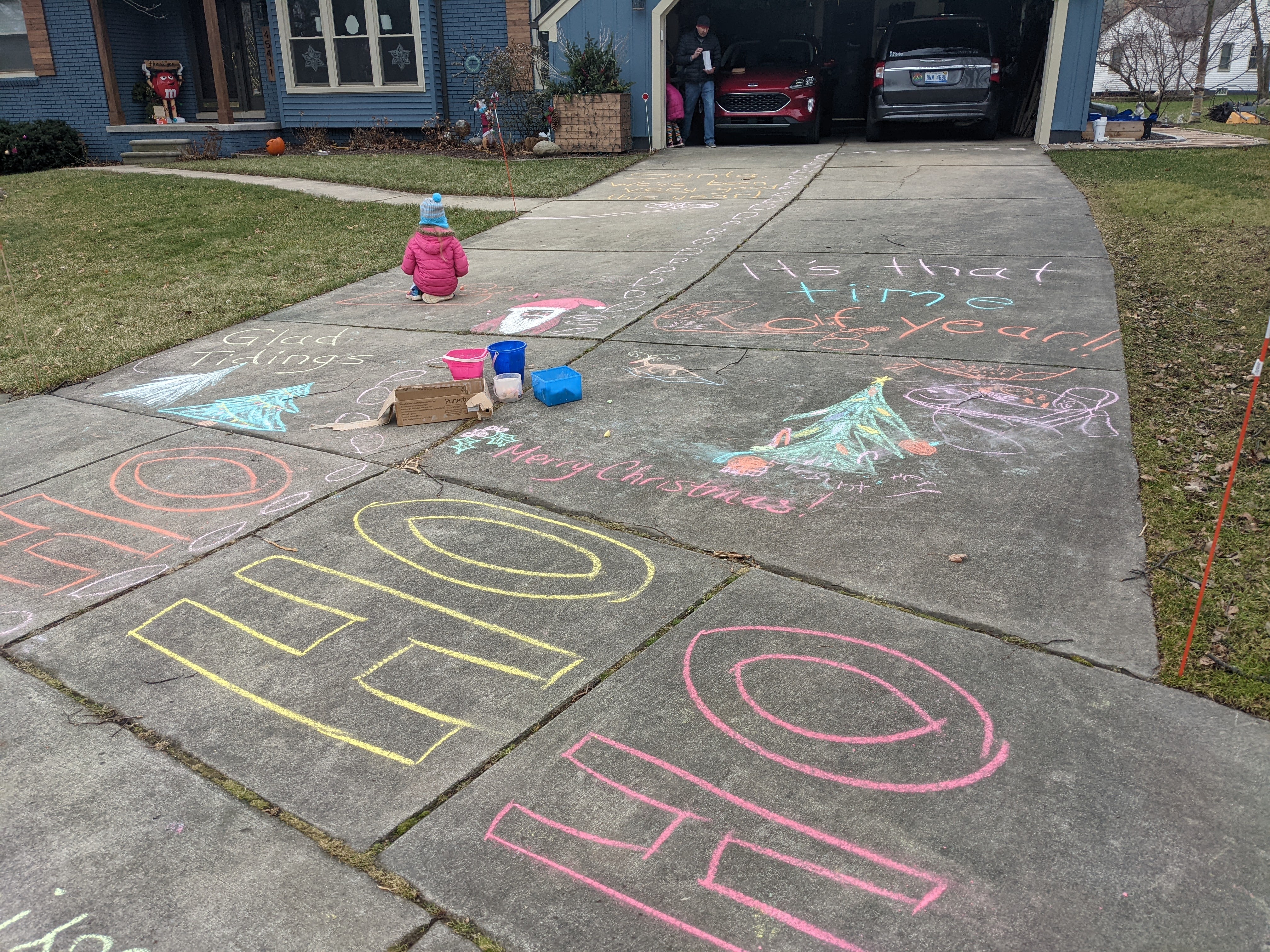 December 24, 2021: OK. Presents are wrapped. Stockings are hung. Decorations are made and hung. Driveway is decorated. Letters to Santa are in the magic mailbox. Cookies, milk, carrots, and COVID mask are out. Santa’s landing lights are out. More presents from neighbors are opened. Off to party with Grammie and Papa and then off to bed. We can’t wait for tomorrow!!!