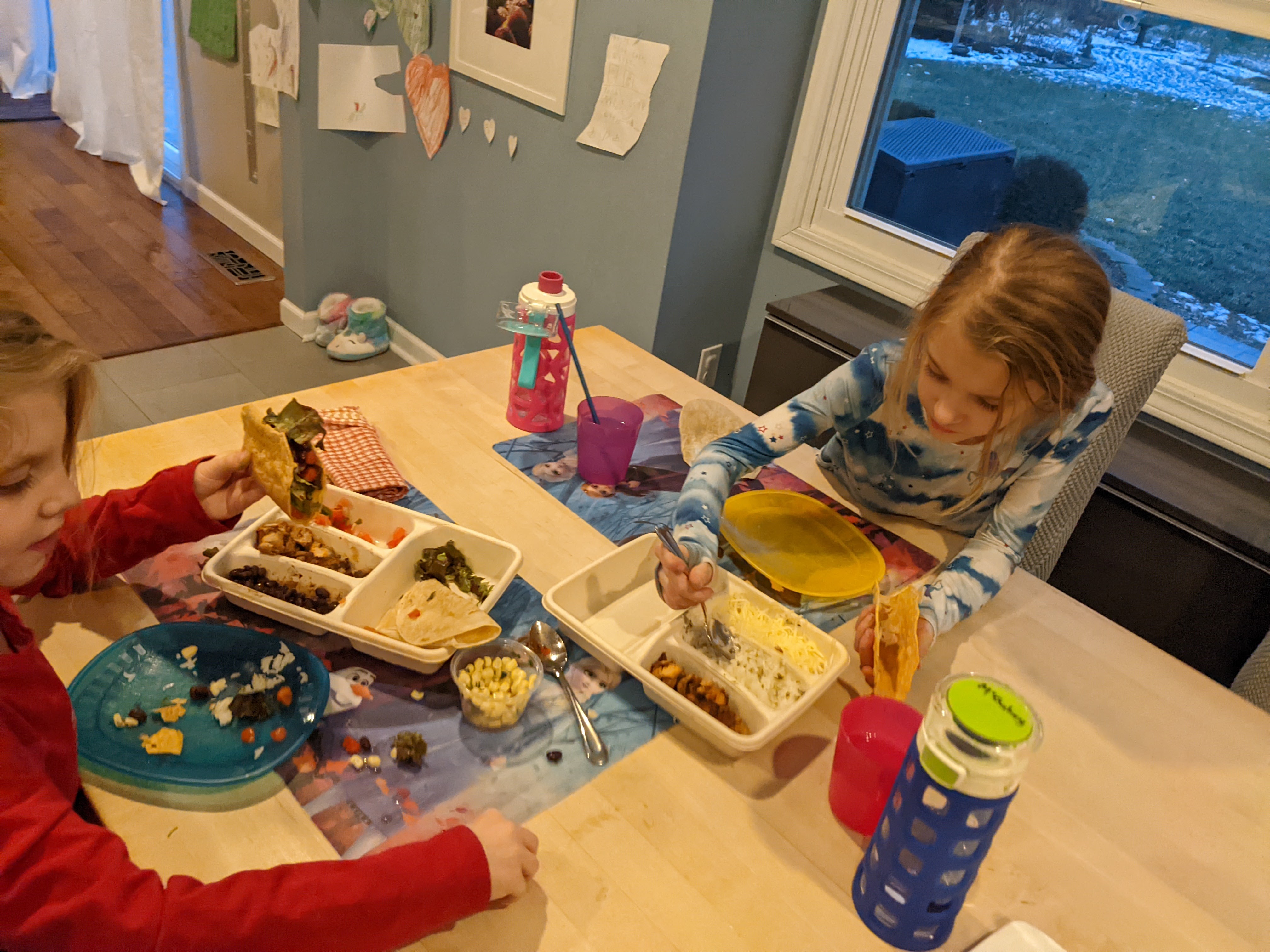 January 13, 2022: I really like making my own food. I also like eating my own food. So when daddy found a to go place where we can build our own tacos I said, YES PLEASE! They even had rice that Jameson likes. This calls for a cookie walk around the block!