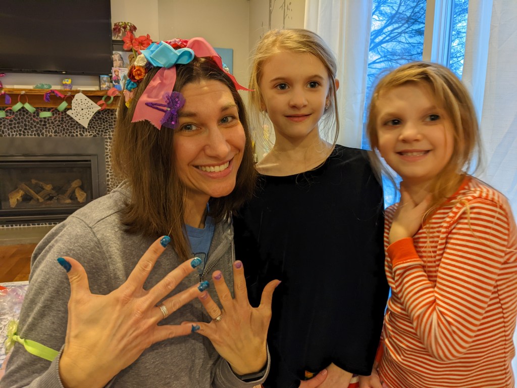February 7, 2022: Valentine’s Day is coming up soon. Today we practiced getting mommy all beautiful for daddy. When we’re done with her spa day he won’t be able to resist her. She looks like a princess!