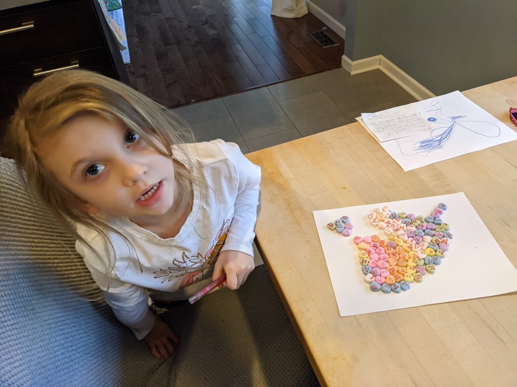 February 8, 2022: I’ve got another school project…100 days of school. Jameson has been feeling left out because her class never gets these fun things to do. We do them as a family instead and that way we all get to do one! I used 100 candy hearts to make a unicorn. Jameson made a kitty. Mommy made a pine tree with 100 pine needles. Daddy hasn’t done one yet. It’s due Friday so he better get on it!