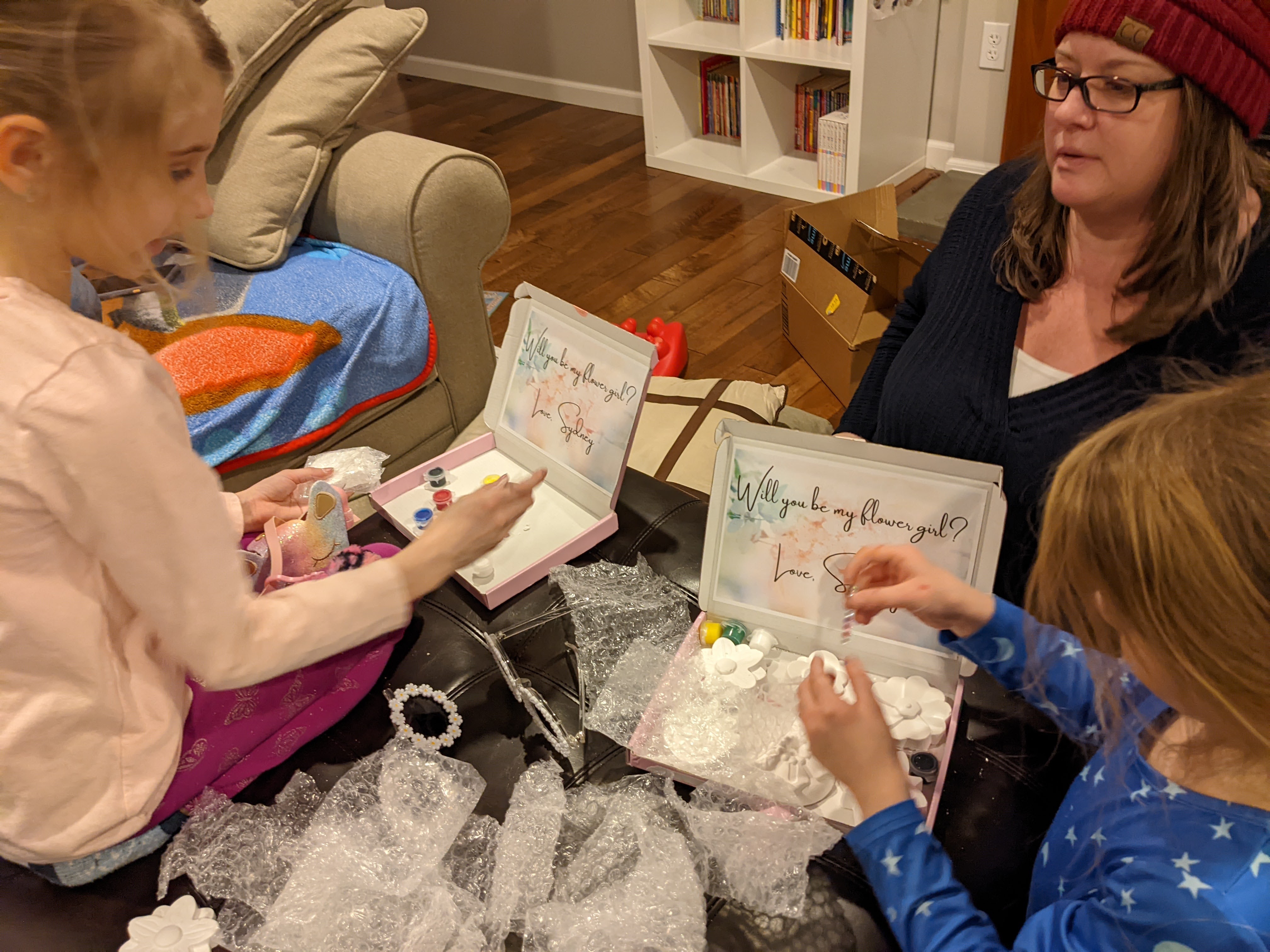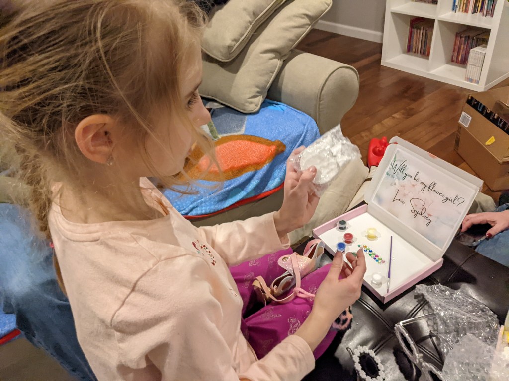 February 11, 2022: It was a normal Friday. We went to school. We ate dinner. Then Aunt Ellen stopped by! So cool! She brought Jameson’s birthday present. Wait, she also had presents for us from Sydney?! Cool! The boxes had are names on them in fancy writing. Neat! Then inside the box… WILL YOU BE MY FLOWER GIRLS?!?!?!?! WHAT?!?! I HAVE GO TO MY ROOM TO FAINT!!!! YES YES YES YES YES YES YES!!!