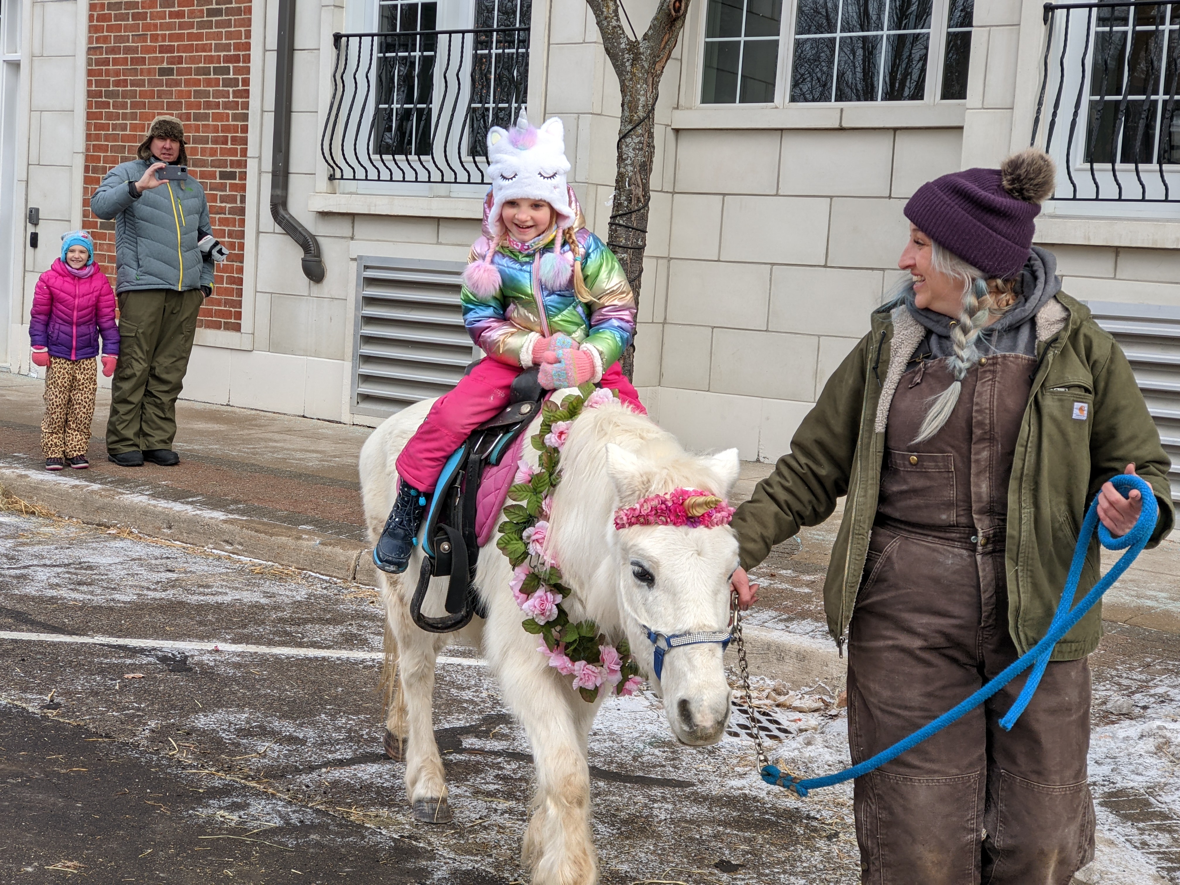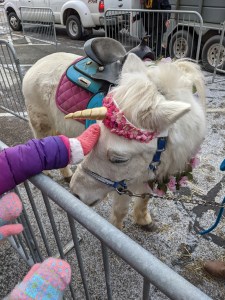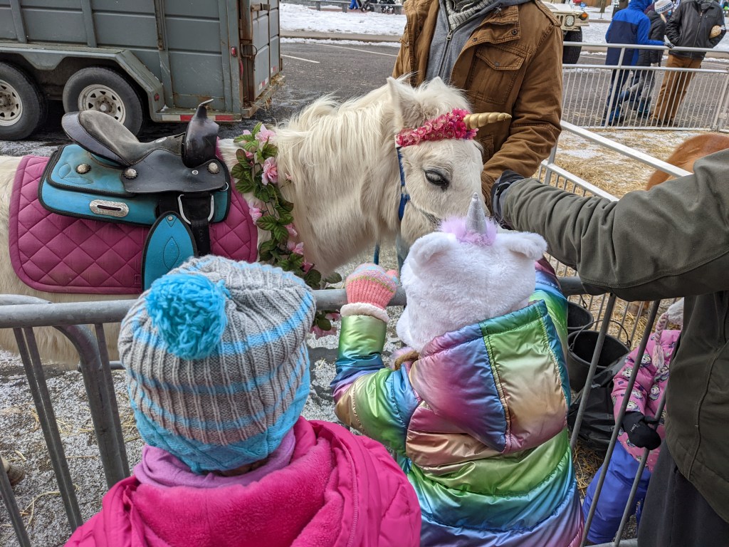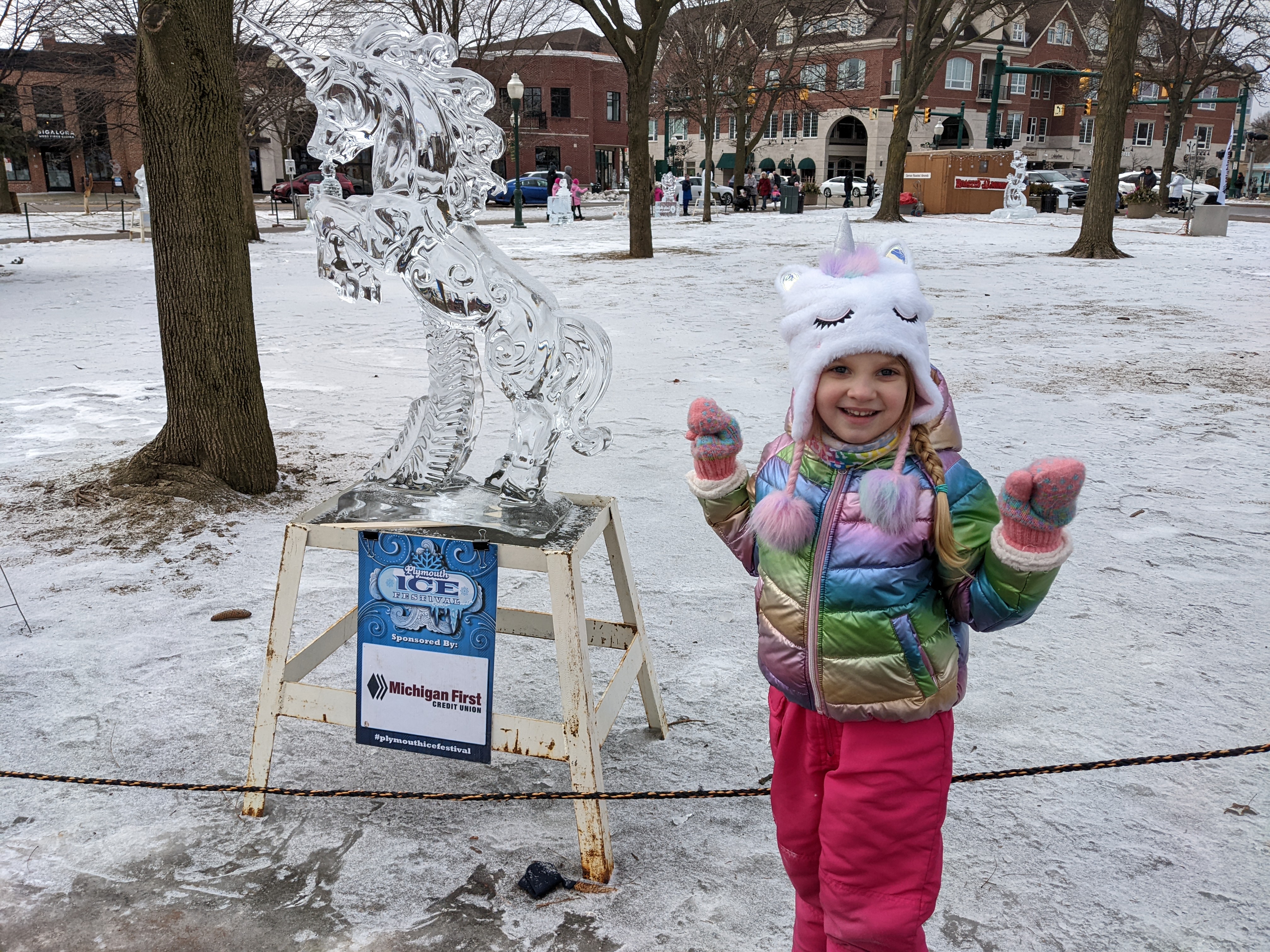February 13, 2022: Just when we thought our weekend couldn’t get any better, it DID! We went to the Plymouth Ice Festival to look at amazing ice sculptures and just happened to find a unicorn giving rides! Yup! You heard that right! Well, it was a pony but she had a horn on and a flower necklace and we got to ride her. It was our first horse ride and she was dressed like a unicorn. We couldn’t believe our luck. We’re going to remember this weekend forever!