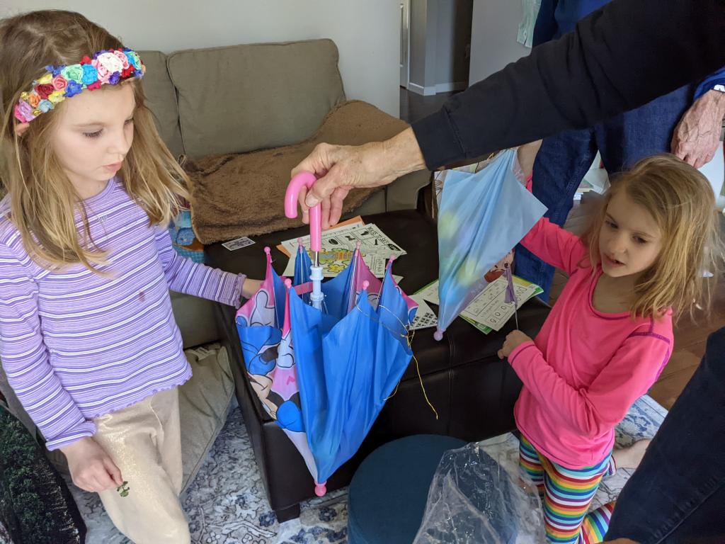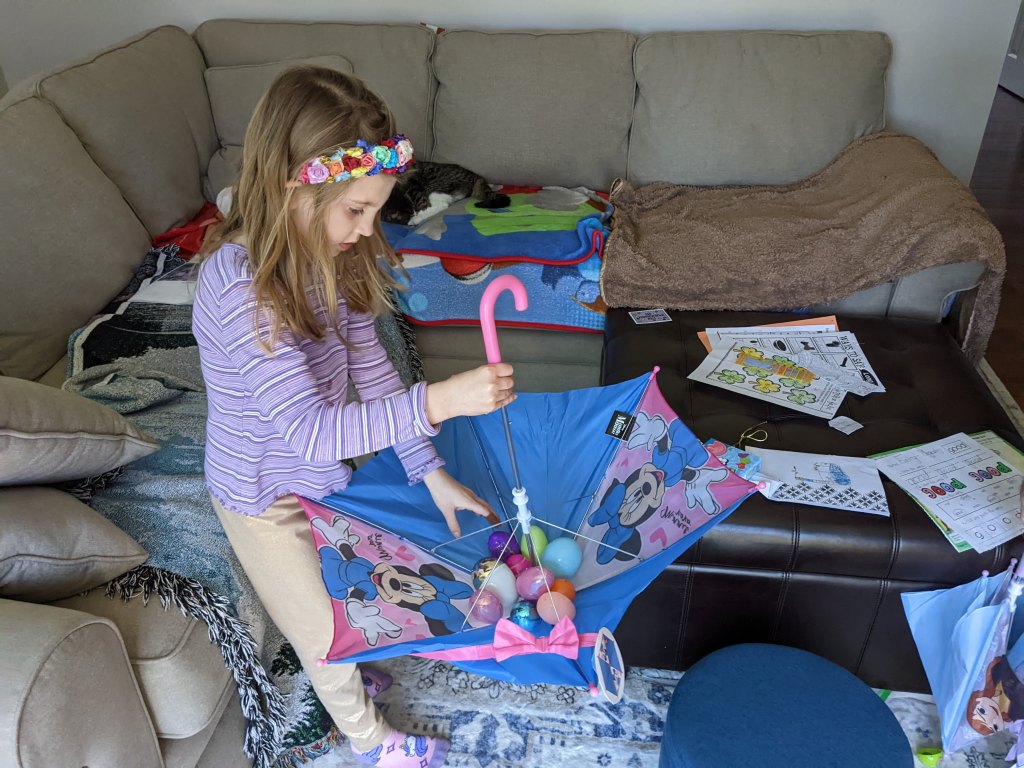 April 12, 2022: Daddy had to leave for a work trip today. He won’t be gone long, but mommy needs help. Enter grammie and papa, they’re like the Cat in the Hat. We play silly games with them…like balls in umbrellas. Classic.