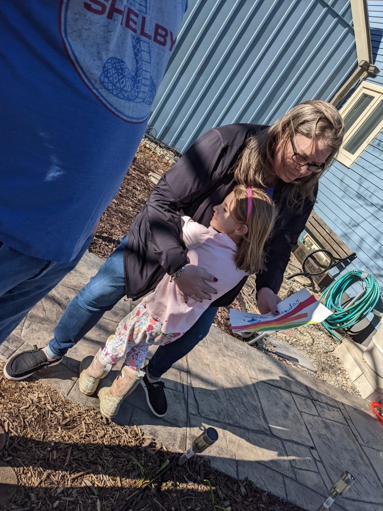 April 21, 2022: What a nice surprise! Aunt Ellen stopped by on her way home from the airport and we were not expecting her! She even gave us our special grampa posters which have been in her car forever. And as an extra surprise she gave us huge pictures of grampa! We miss him a lot so they will be nice to hang in our rooms.