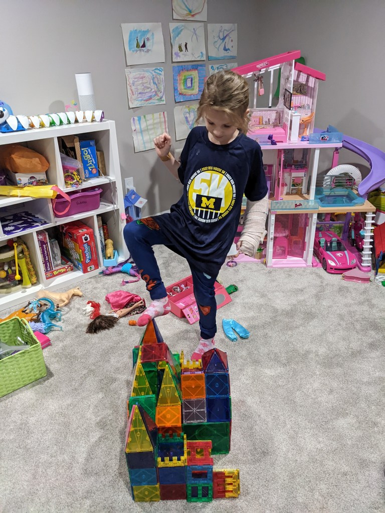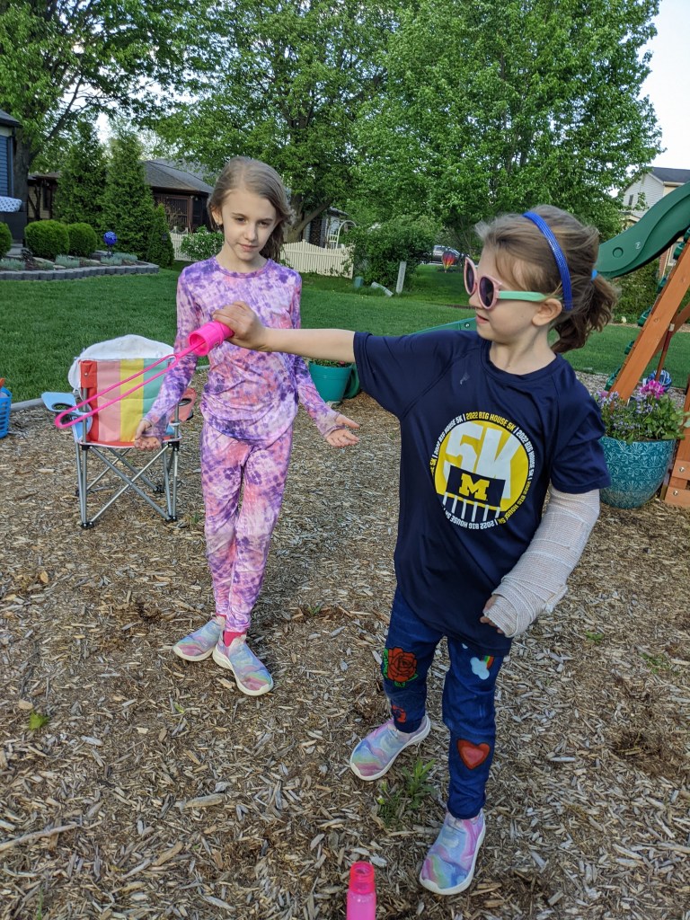 May 16, 2022: We’re big kids now, but we still like to pop bubbles. If you’re blowing them for us, we’re popping them. It’s also a safe play choice we can choose with Finley’s hurt arm.