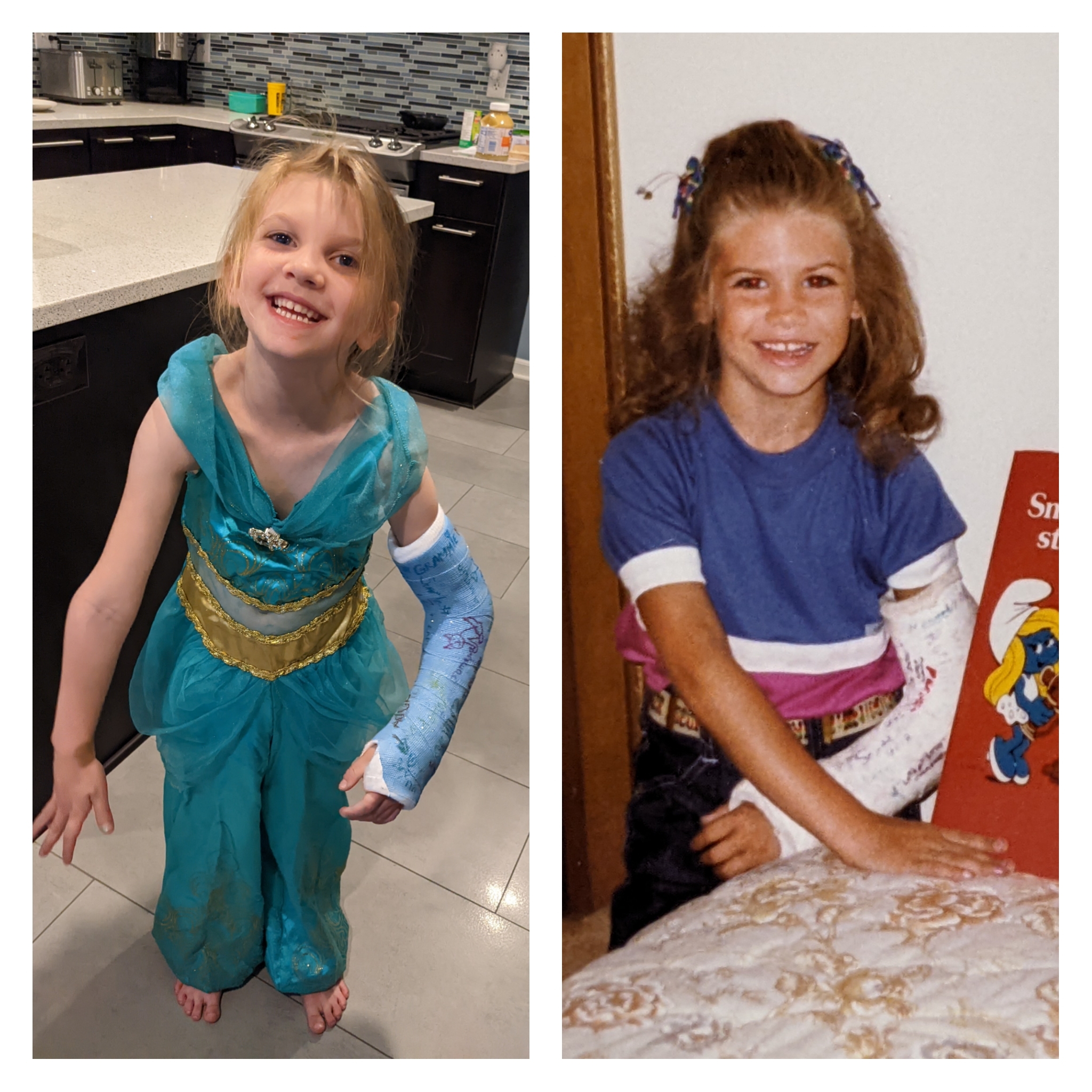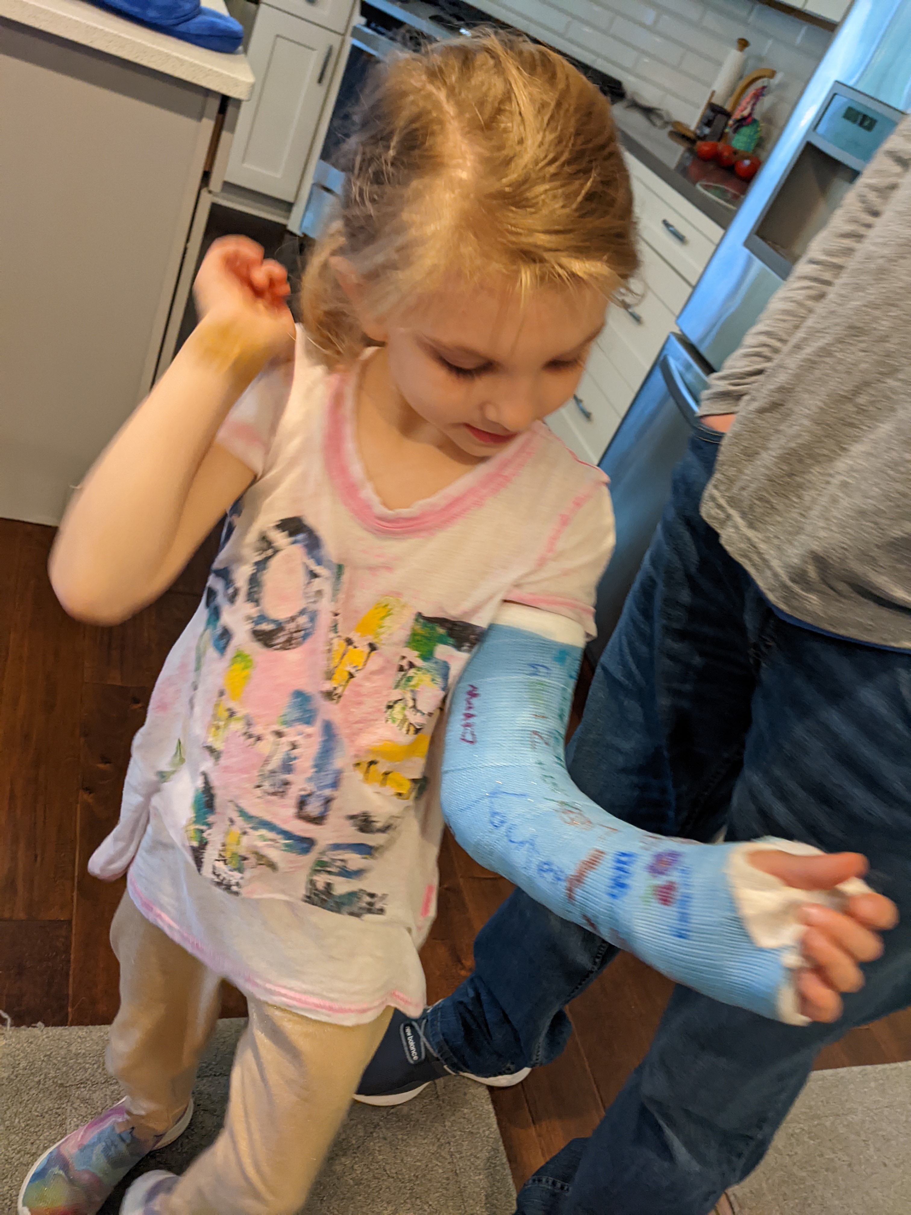 May 18, 2022: Papa got a new car! It’s so cool. We got to sit in the way back and tried out the seats without carseats. We showed everyone that we can use the seatbelts without any help. We cannot wait until we don’t need carseats. It should be only another year or two! Also, I got more signatures on my cast and mommy found pictures of her cast when she was five. Mine is so much cooler!