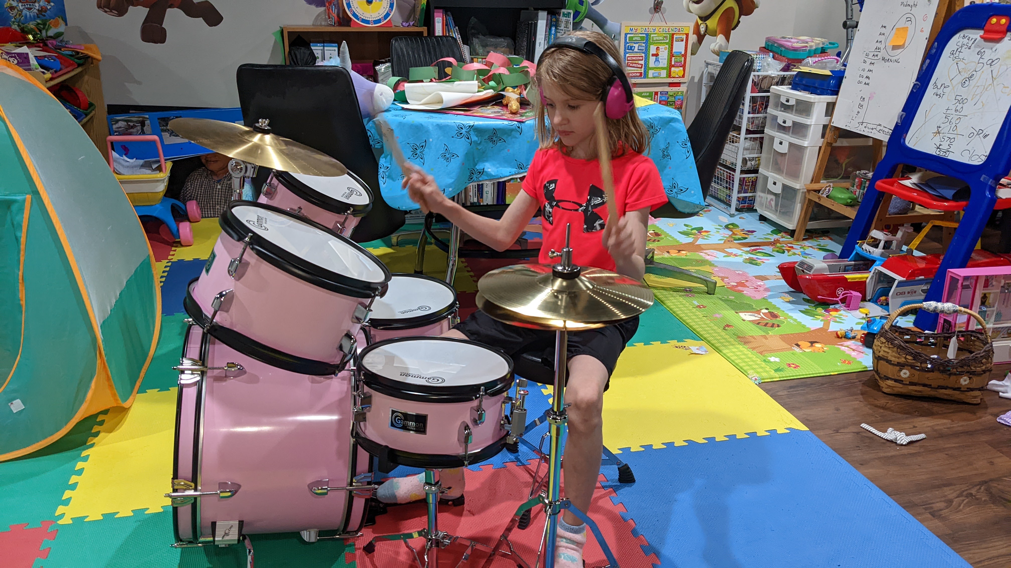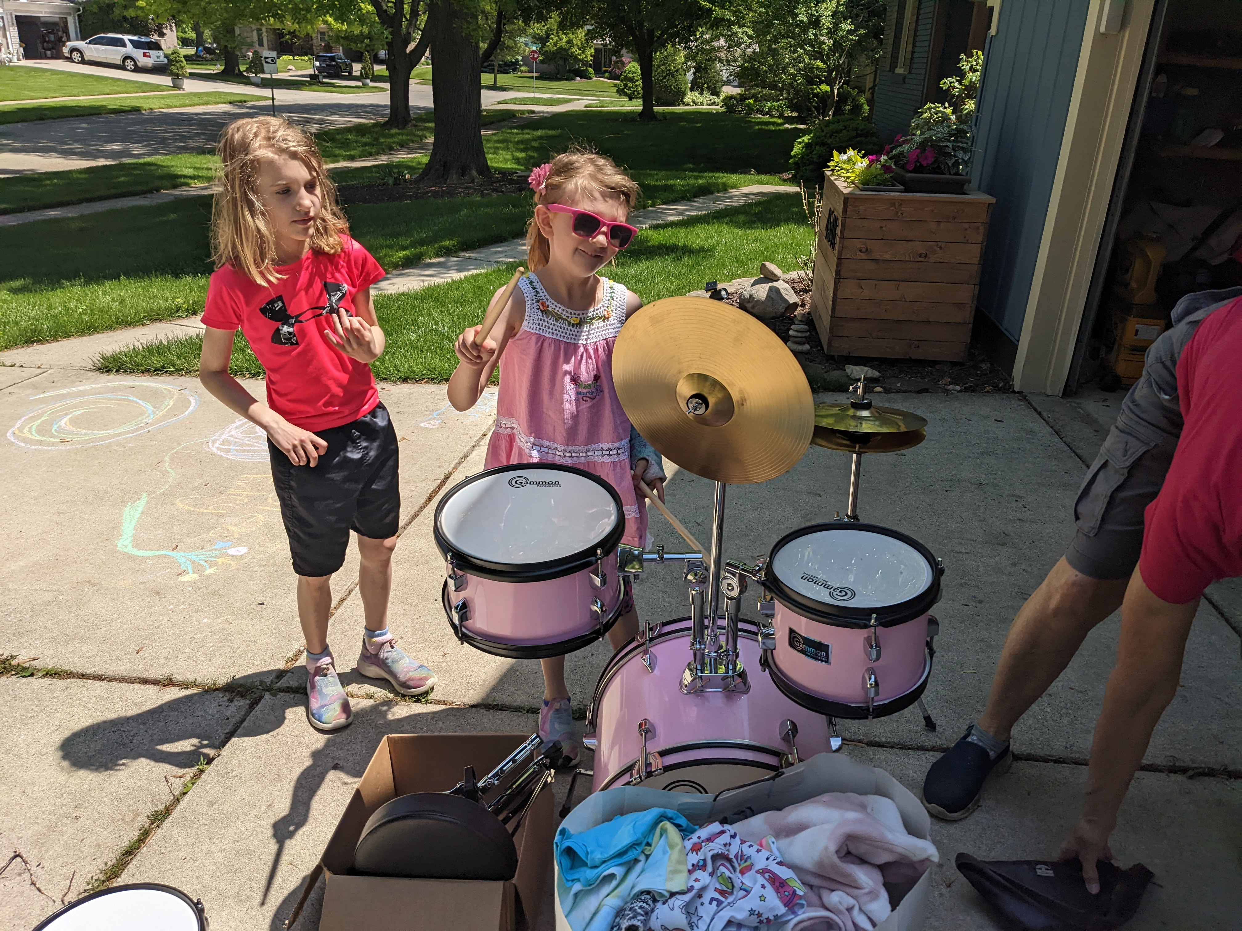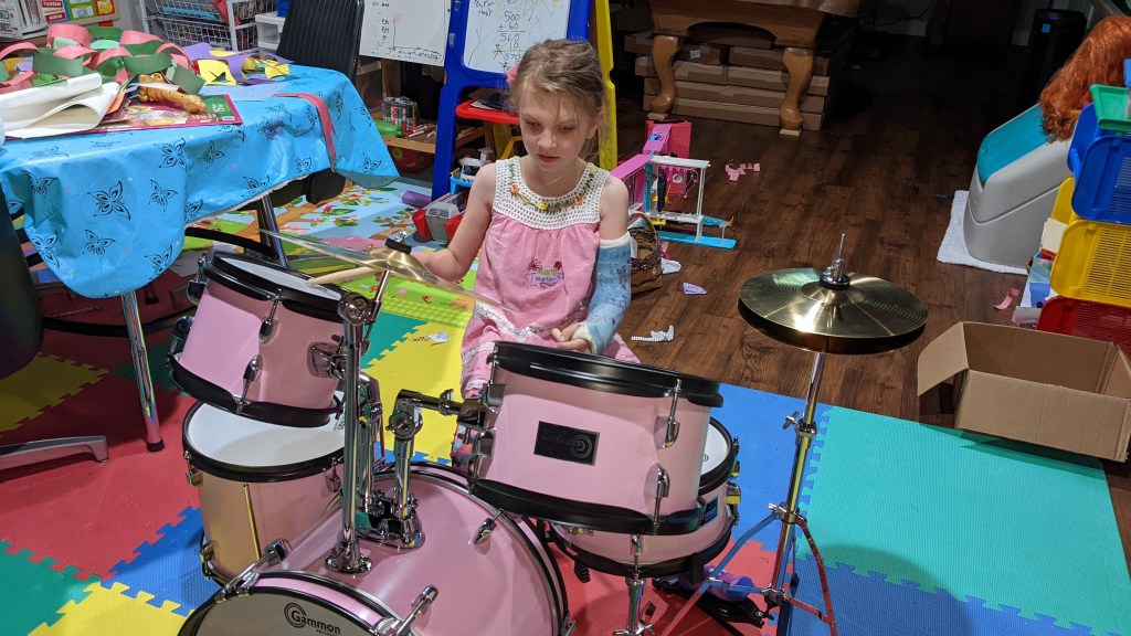 May 30, 2022: I was feeling better today, which was great timing because our neighbors left us a beautiful pink drum set on our driveway! We were NOT expecting that and we were super excited! What a great surprise! Oh, and good news. I can still play with one arm in a cast!