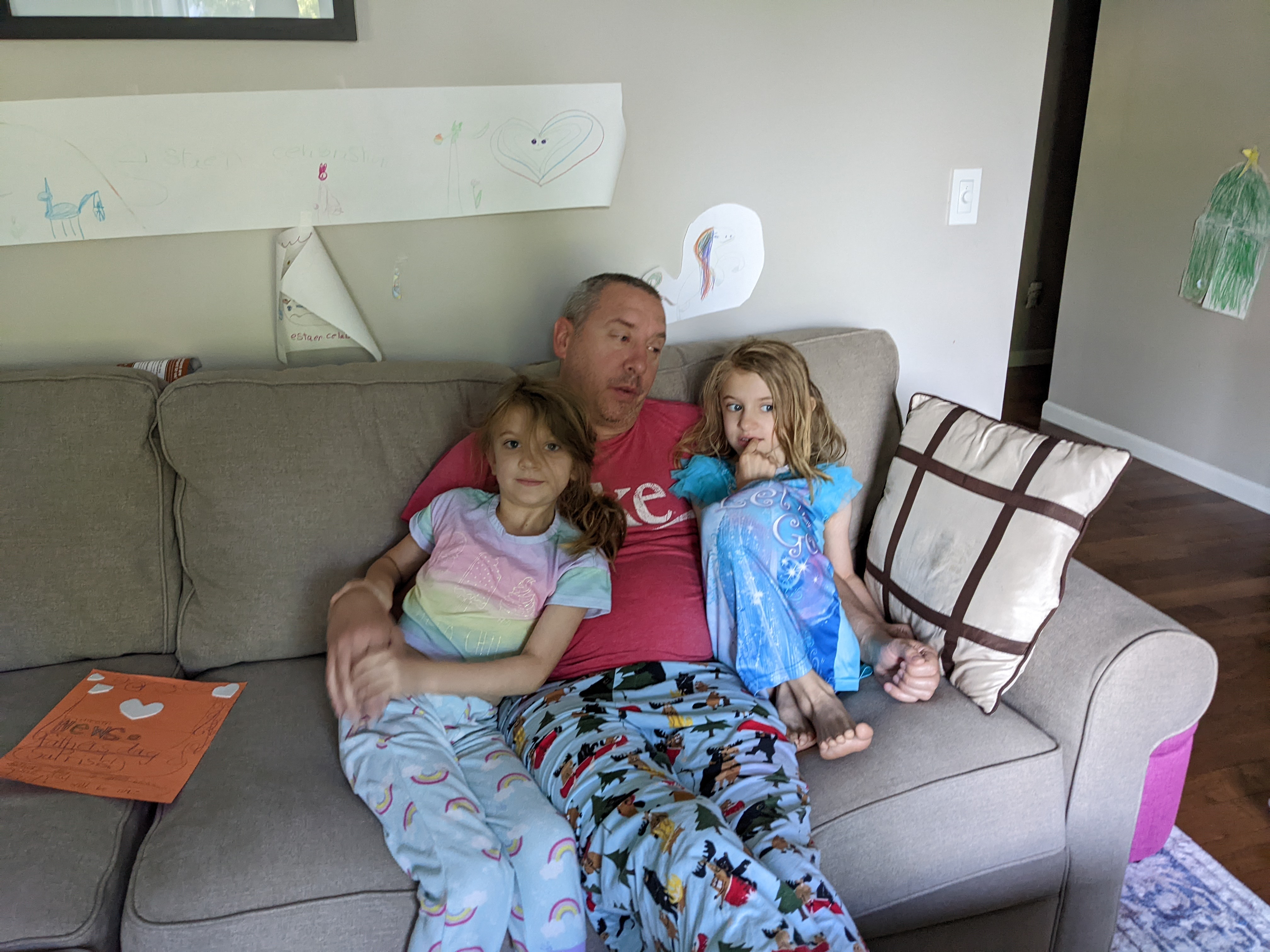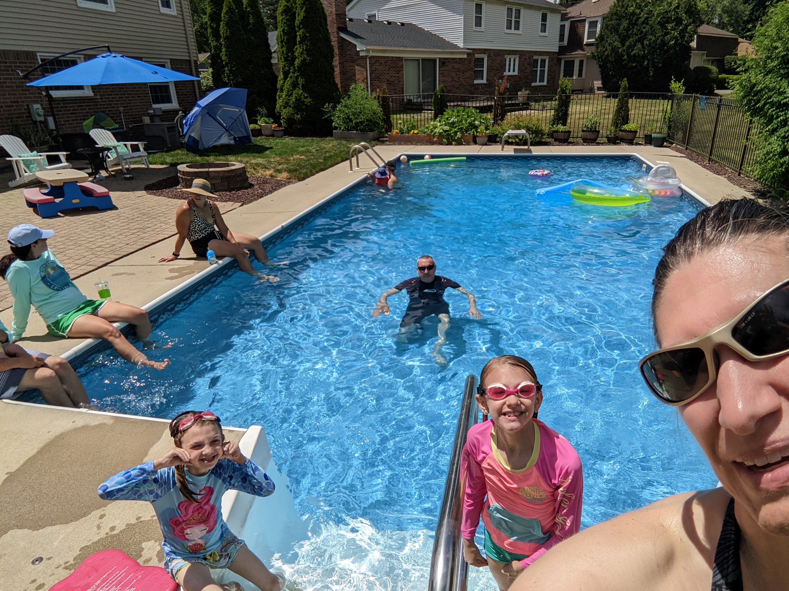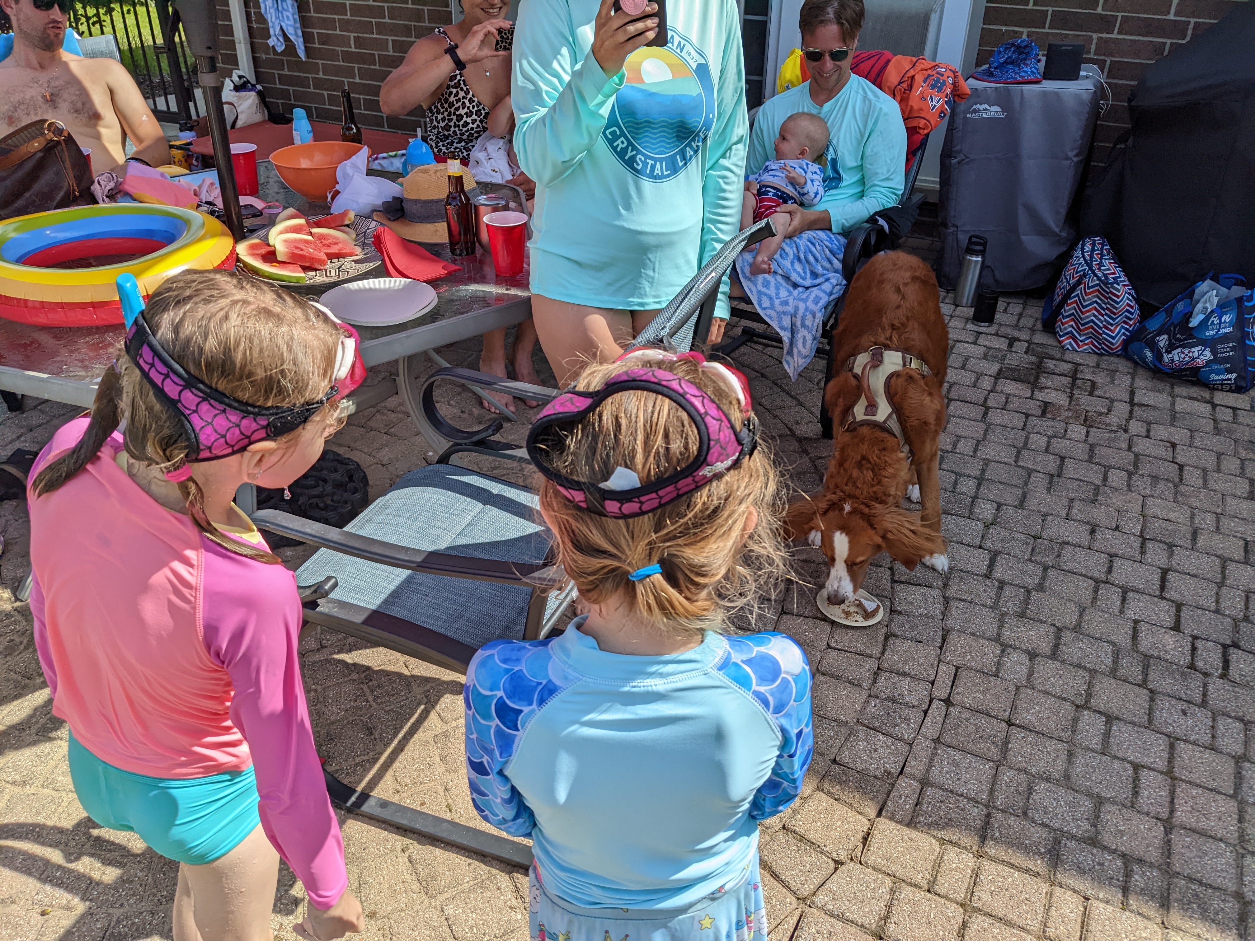 June 25, 2022: Our daddy is so sneaky! He told us he would be home late Saturday night. We obviously hoped he’d come back on Friday instead and be home in time for our neighbor dog’s birthday pool party on Saturday, but we understood. BUT this morning we woke up and found him sitting on the couch!!!!!!!!! Best. Surprise. Ever. We missed him so much. It felt so good to hug him and cuddle him. The pool party was so much better with daddy there!