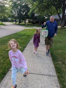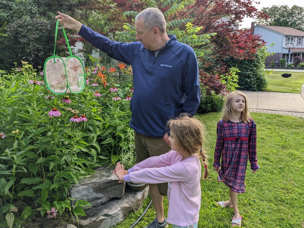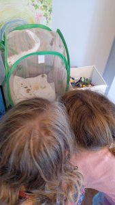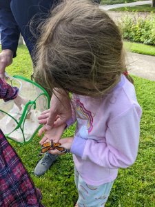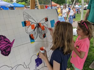 July 8, 2022: We released four of our butterflies this morning. Seeing them fly off was super cool. But we also got to see one come out of the chrysalis which was even cooler! When we heeded into town for the art fair, we painted a square on the kids’ mural and it had a Monarch in the picture! Now that I think about it, we should’ve had Chris draw us as butterflies instead of a kitty and unicorn. Oh well, next year!