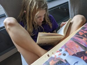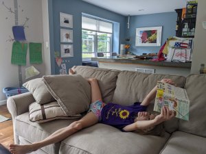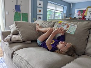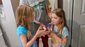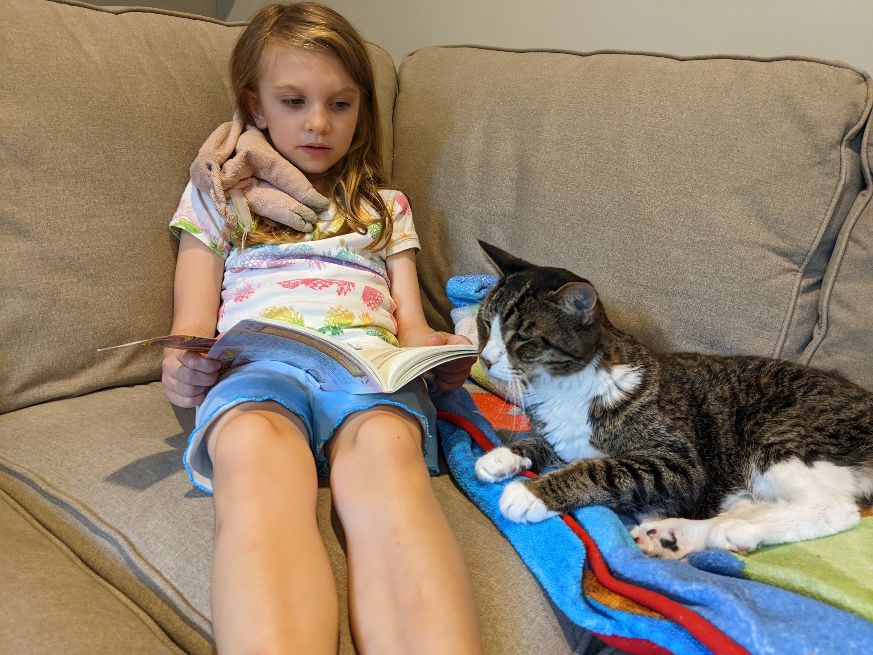July 13, 2022: Hey, I may be allergic to cats but that’s not going to stop me from loving on Harley. If mommy’s taught us anything about cats, it’s that you drop everything when they want attention. So when Harley wanted to cuddle and listen to me read, I did exactly that. Plus, Jameson showed me how she does her puffer and then helped me do mine. What cat allergy?! There are benefits to taking all this medicine!
