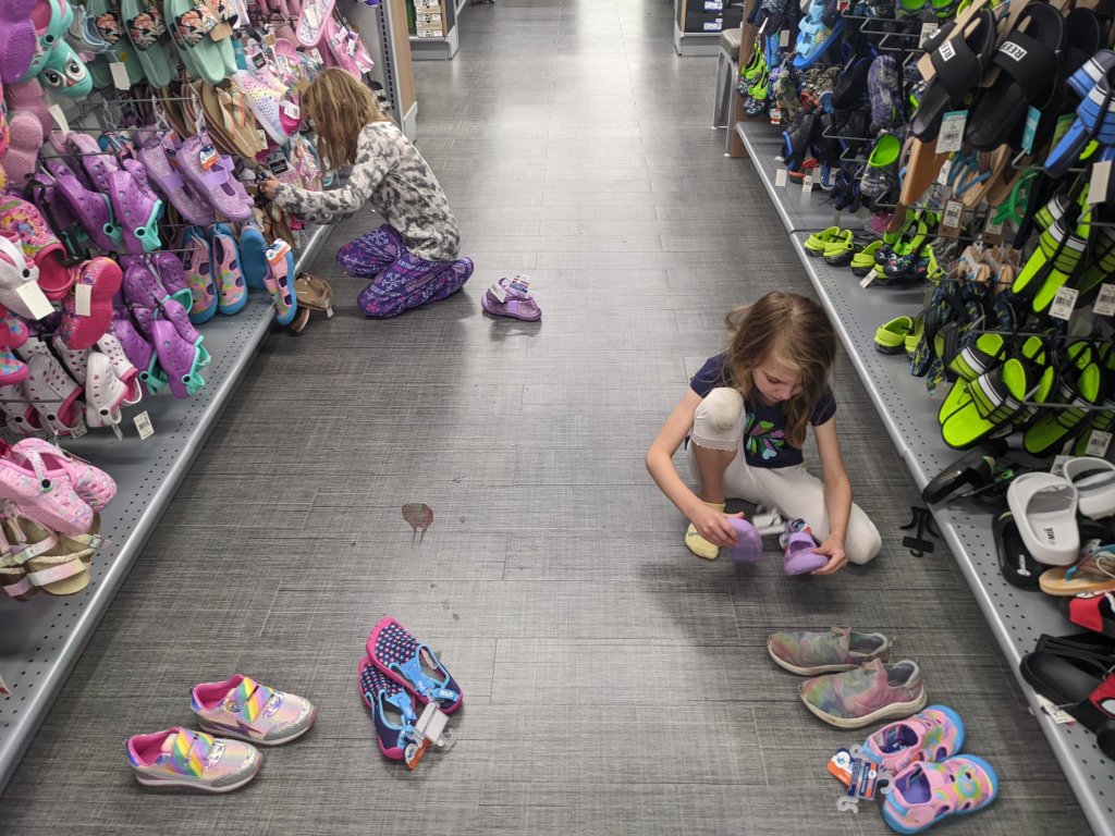 July 22, 2022: We need new water shoes for the cottage. Something that will let us easily walk in the water and on rocks. Good thing we love shoe shopping! Found some cute ones at Meijer. We even tested them out walking around the block. We can’t wait to try them out in the lake!