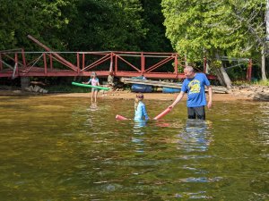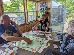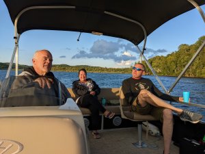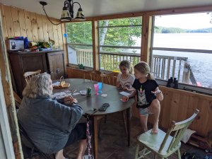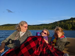 July 28, 2022: It was our last full day at the cottage. We didn’t have any big plans. We just spent the day hanging out. We played games with grandma, did a little swimming, and visited with friends. Not only did we see the MacDonalds and put on a cat play for them, Dennis and Sharon took us on a sunset cruise around the lake! Our cruise ended with Dennis telling us silly grampa stories.. As he finished, beautiful pink clouds appeared and it rained when we pulled into the dock. Grampa left us a note before he died. It said to look to the clouds for kisses from him. He knew pink is our favorite color. We love you too, grampa!