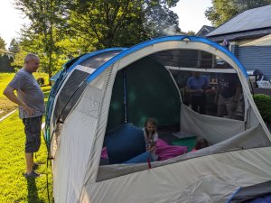 August 10, 2022: After an amazing, exhausting day at the zoo with grammie and Papa, we came home ready to camp in the backyard. It’s a new tradition called our annual backyard campout with daddy!!! We got our stuff in the tent, ate s’mores, and climbed in. Before we knew it, we….fe…