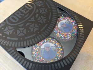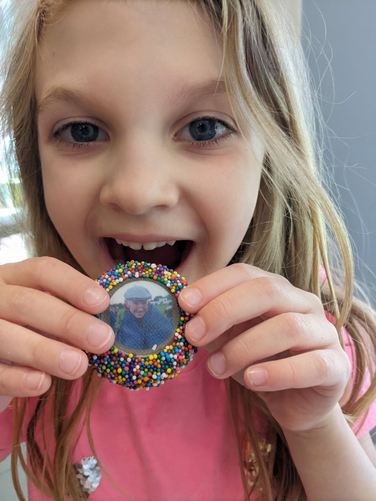 August 12, 2022: We miss grampa a lot. Mommy is always reminding us to look for ways he is always with us. Sometimes it’s a cloud in the sky or a motorcycle riding down the road or a visit by a skunk in our backyard or in a book. And sometimes it’s an Oreo. Oreos were one of grampa’s favorite treats. Today mommy surprised us with special Oreos with blue filling, rainbow sprinkles, and grampa’s picture on it! It was a great treat. Beautiful and yummy! And a perfect way to remember grampa!