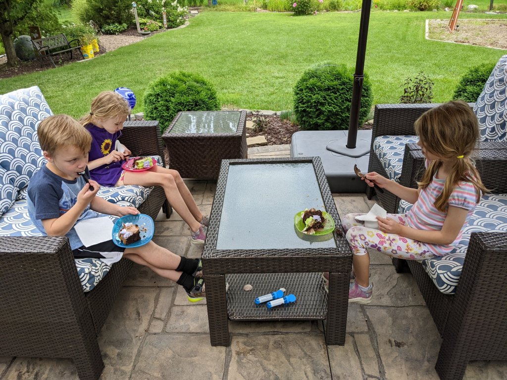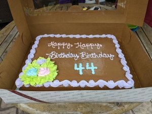 August 14, 2022: Mommy’s birthday is tomorrow but we can’t stand it anymore. We picked up her cake a second time after the first time it had the wrong frosting. We aren’t new here. You don’t bring mommy a vanilla frosting cake home for her birthday. By the time we got home we just had to taste it. Don’t worry, mommy is famous for opening her birthday stuff early.