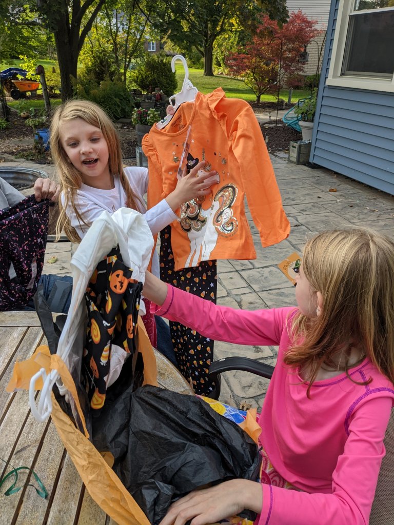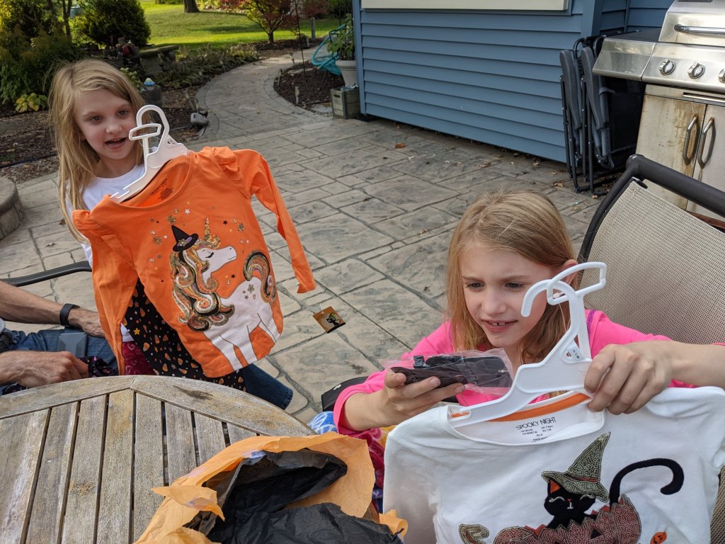 October 5, 2022: Grammie came over with Halloween presents! We were so surprised! She found Halloween unicorn and kitty shirts for us. Totally purrfect for us!