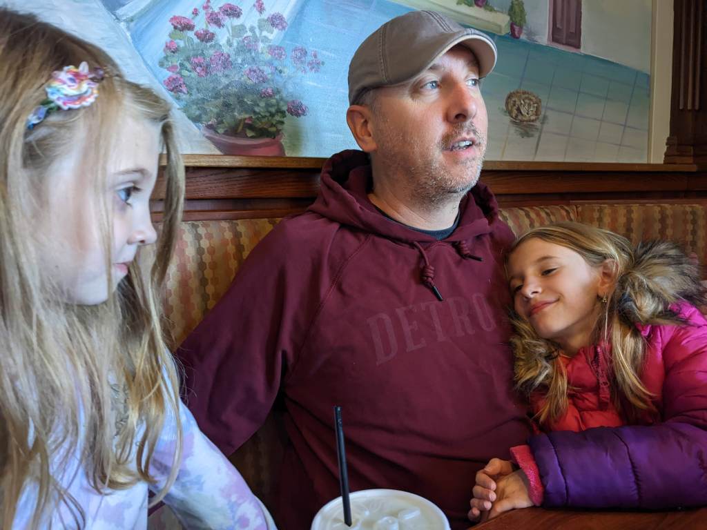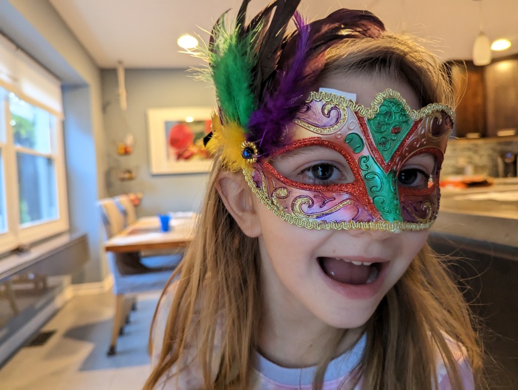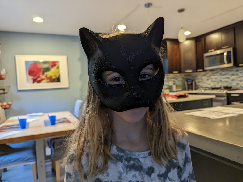 October 20, 2022: Daddy’s home again! He surprised us by meeting us at the restaurant after school. He likes to get us presents when he goes on his work trip and this time he nailed it. Cat and rainbow masks from New Orleans?! Awesome!