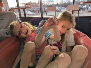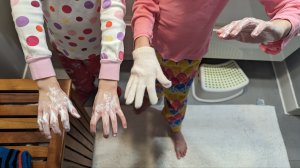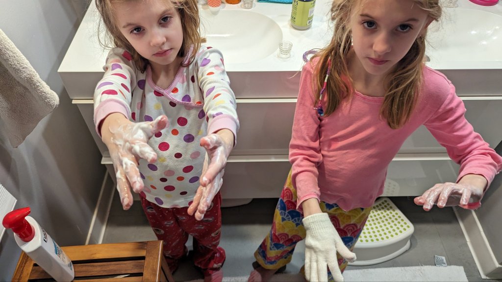 February 6, 2023: Time for Jameson to get in on the lotion-glove action! She said her hands were dry too, so I recommended she try daddy’s glove trick. Totally worked!