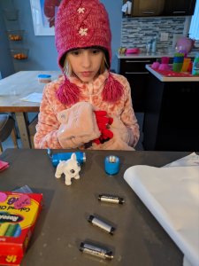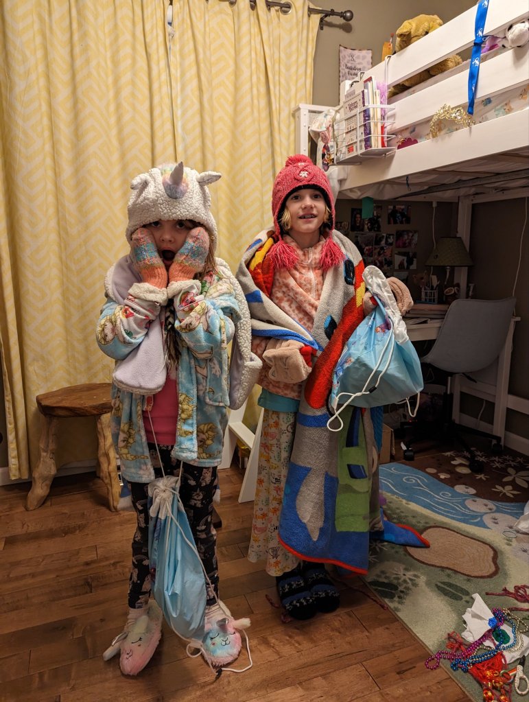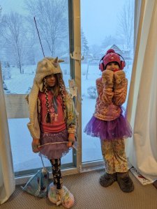 March 3, 2023: When we got out of school it was snowing like crazy! At home the power kept flickering on and off. We were really worried we were going to lose power and that there would be no heat. Just in case we got prepared. We found our flashlights and put on layers and layers of clothes, plus our hats, mittens, and scarves. Mommy and daddy said we were going to be fine, but we didn’t want to take any chances! Better to be safe!