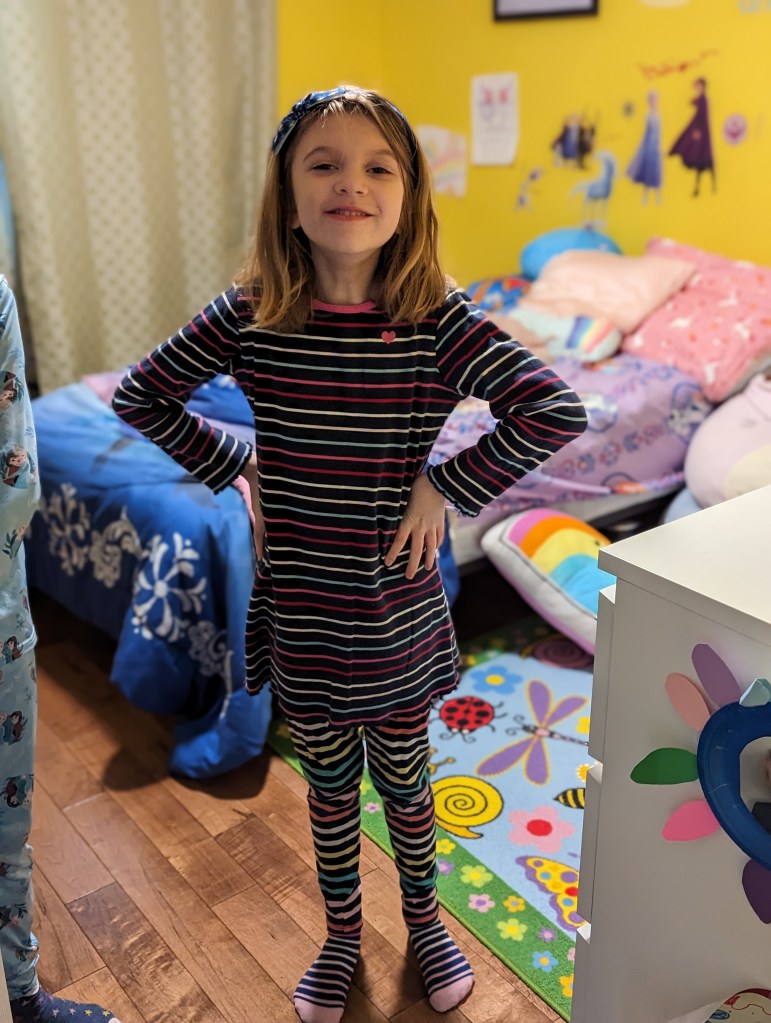 March 7, 2023: I love rainbows. I have clothes with pictures of rainbows on them, but they don’t make ME look like a rainbow. That’s why I picked out striped clothes to wear today. My shirt, pants, and socks all have similar colorful stripes. I think there’s over 150 stripes from my toes to my neck. Now that is commitment.