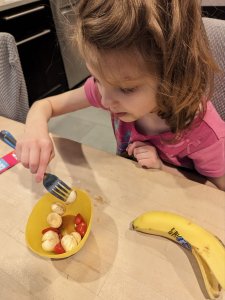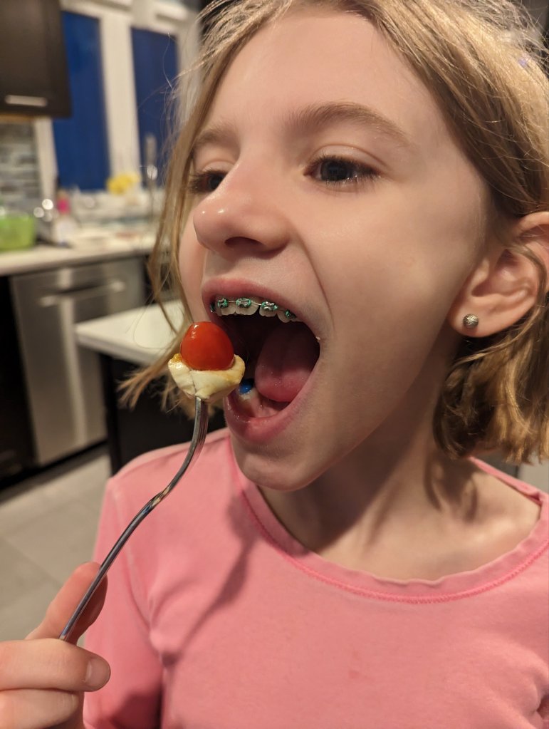 April 3, 2022: Mommy and I like to eat mozzarella cheese balls with tomatoes and balsamic vinaigrette. Jameson usually thinks it’s yucky. We told her she would like it but she didn’t believe us. Then, the other day she tried the cheese. She didn’t mind it. Today she asked for it ALL. No joke. She ate it and she liked it! Told ya so!