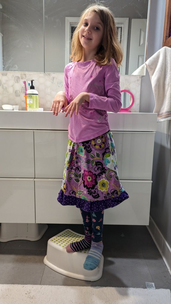 April 28, 2023: Fancy Friday started off in a new skirt for Fin and dangly earrings for me. We looked great and felt great. The day ended with a movie night on the couch in our jammies and me with a stuffy nose. Ugh. Another head cold?! Are you serious?